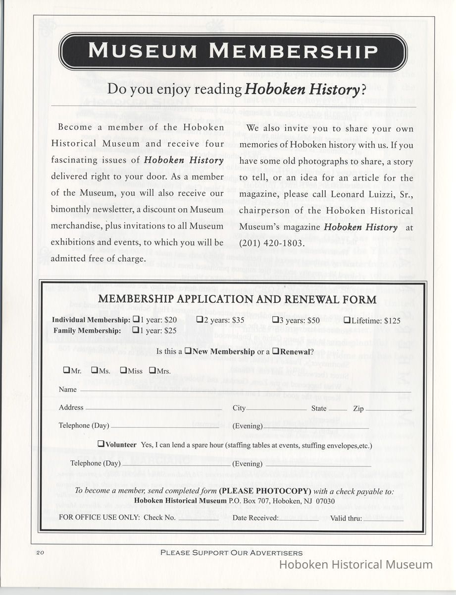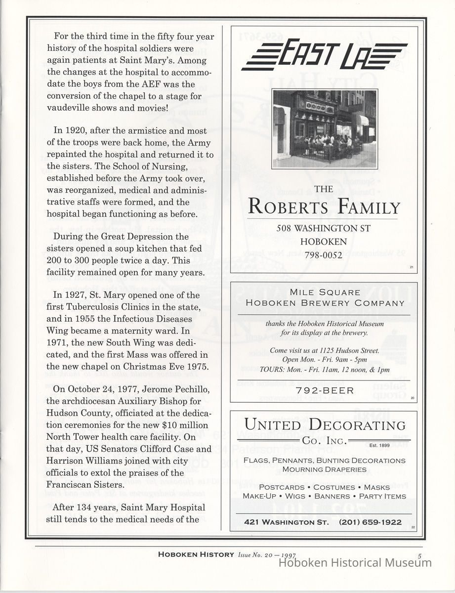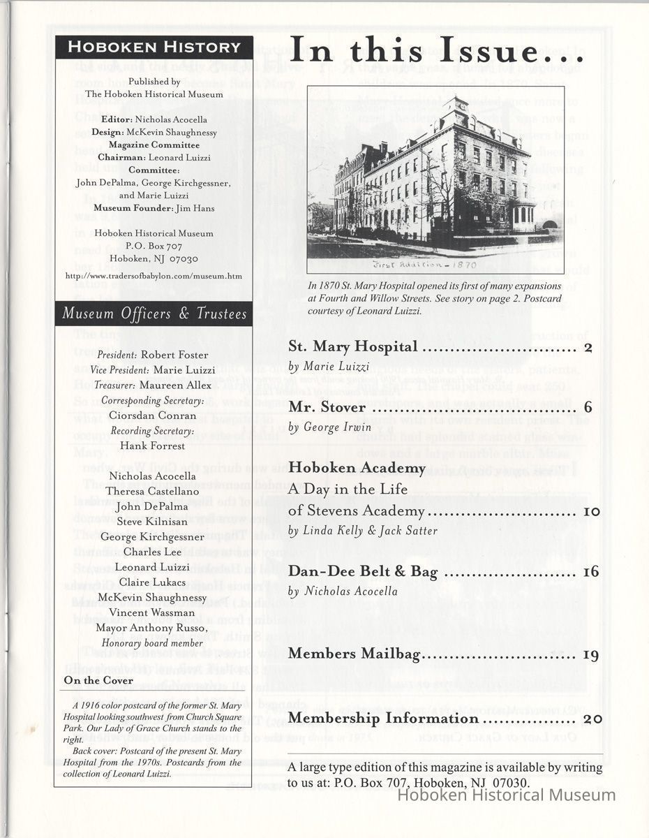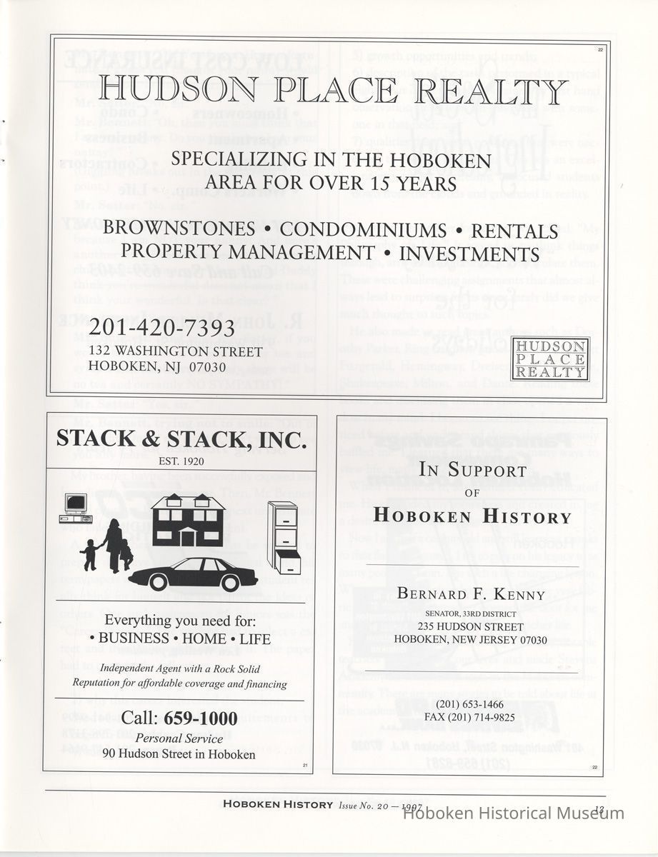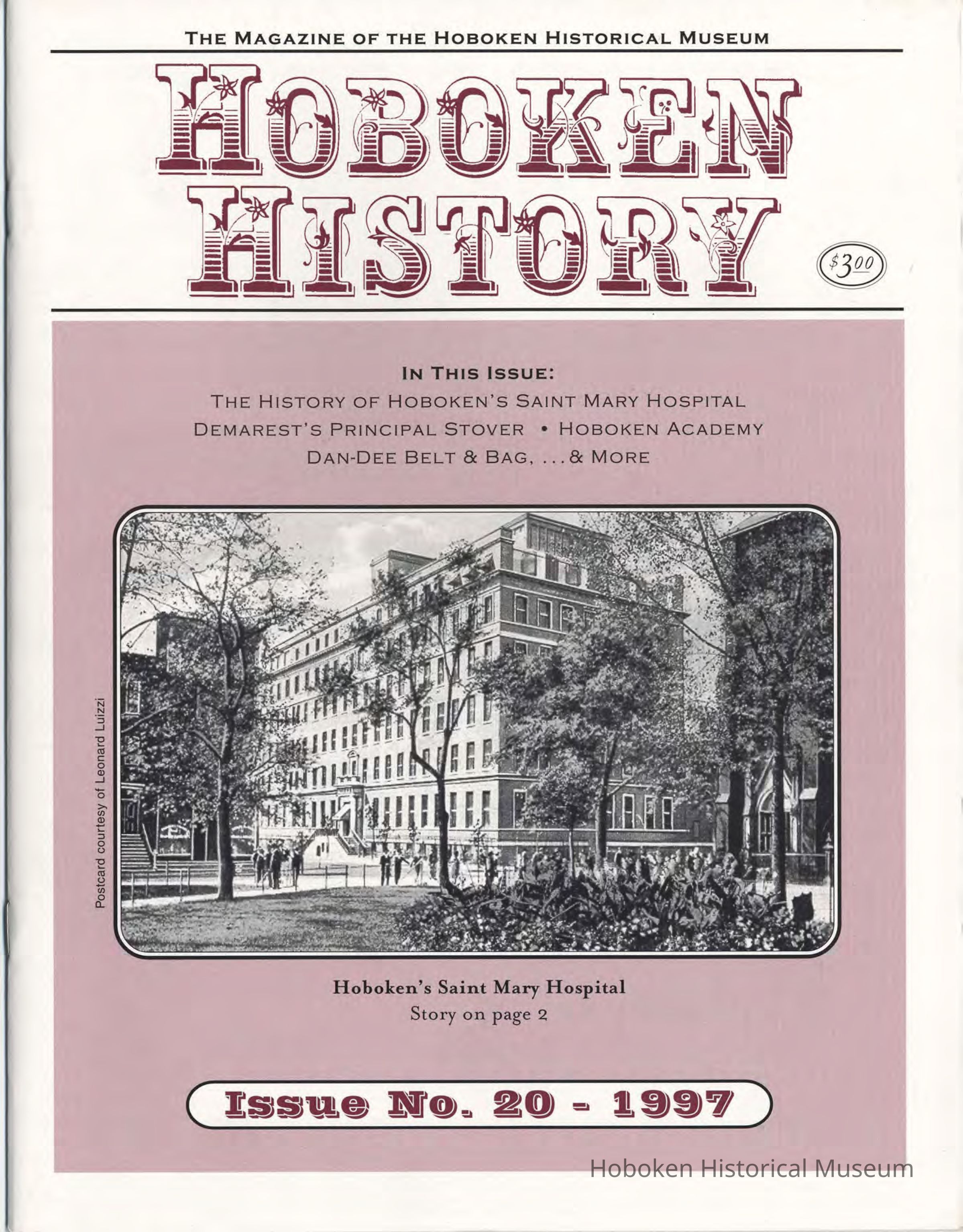 Hoboken History, Number 20, 1997. The Magazine of the Hoboken Historical Museum. Booklet. pp. 20 plus covers, illustrated. 8-3/8" wide x 11" high. 5 copies. PDF on file.