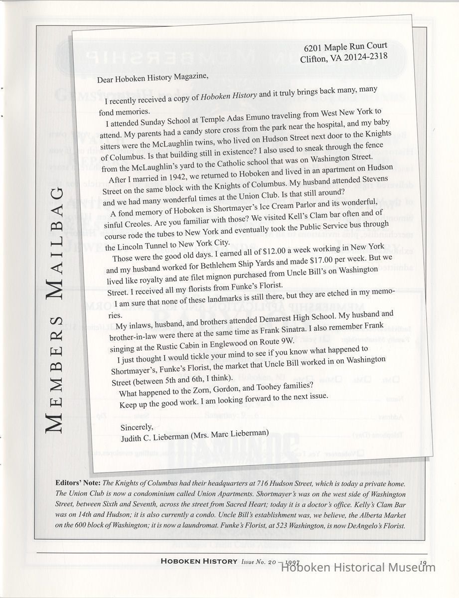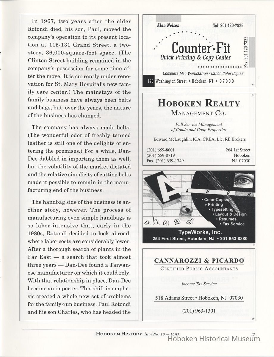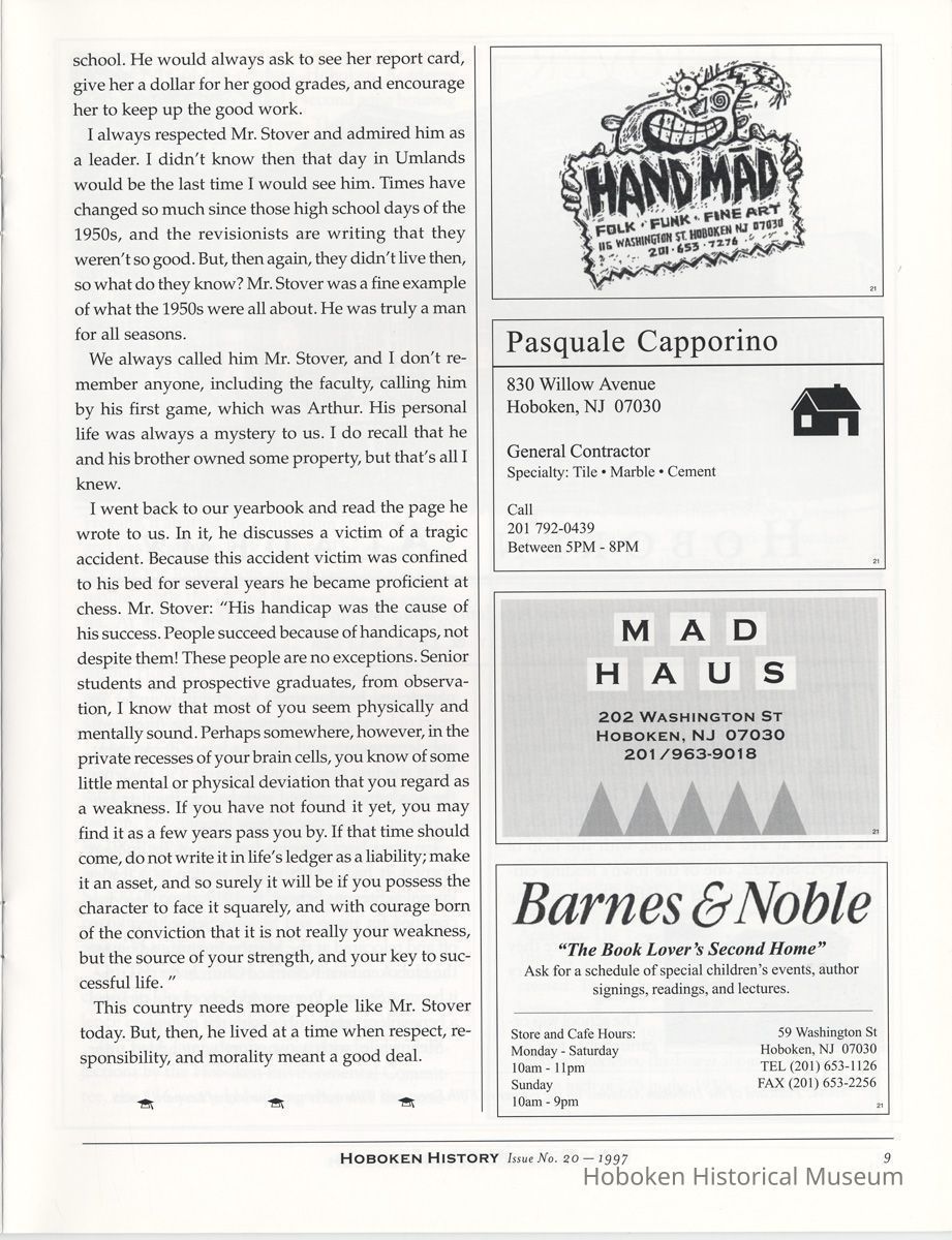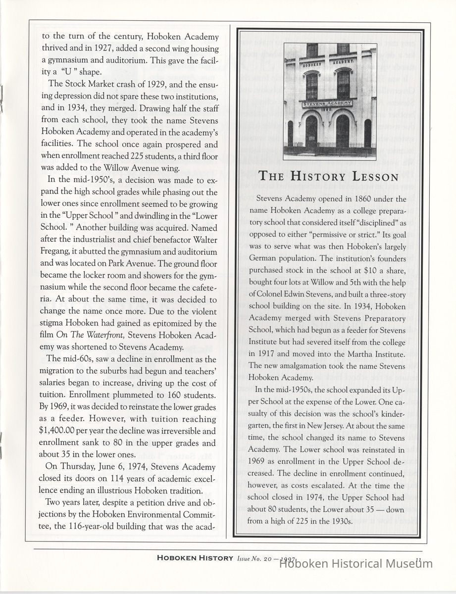 Hoboken History, Number 20, 1997. The Magazine of the Hoboken Historical Museum. Booklet. pp. 20 plus covers, illustrated. 8-3/8" wide x 11" high. 5 copies. PDF on file.