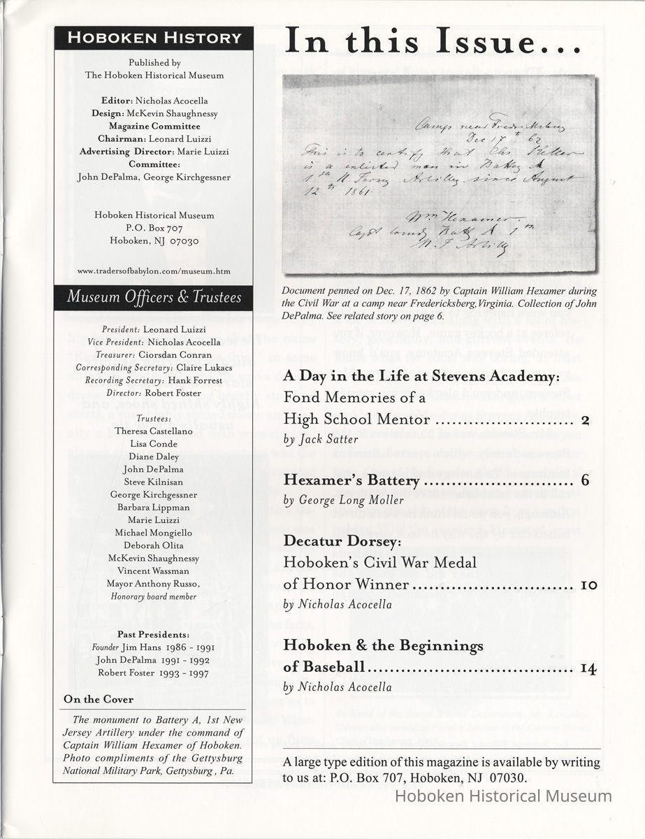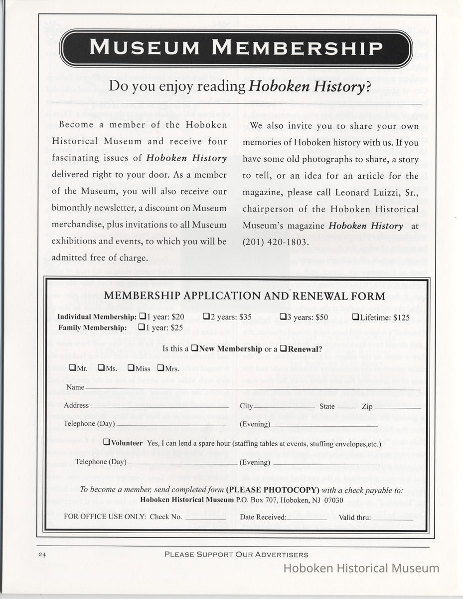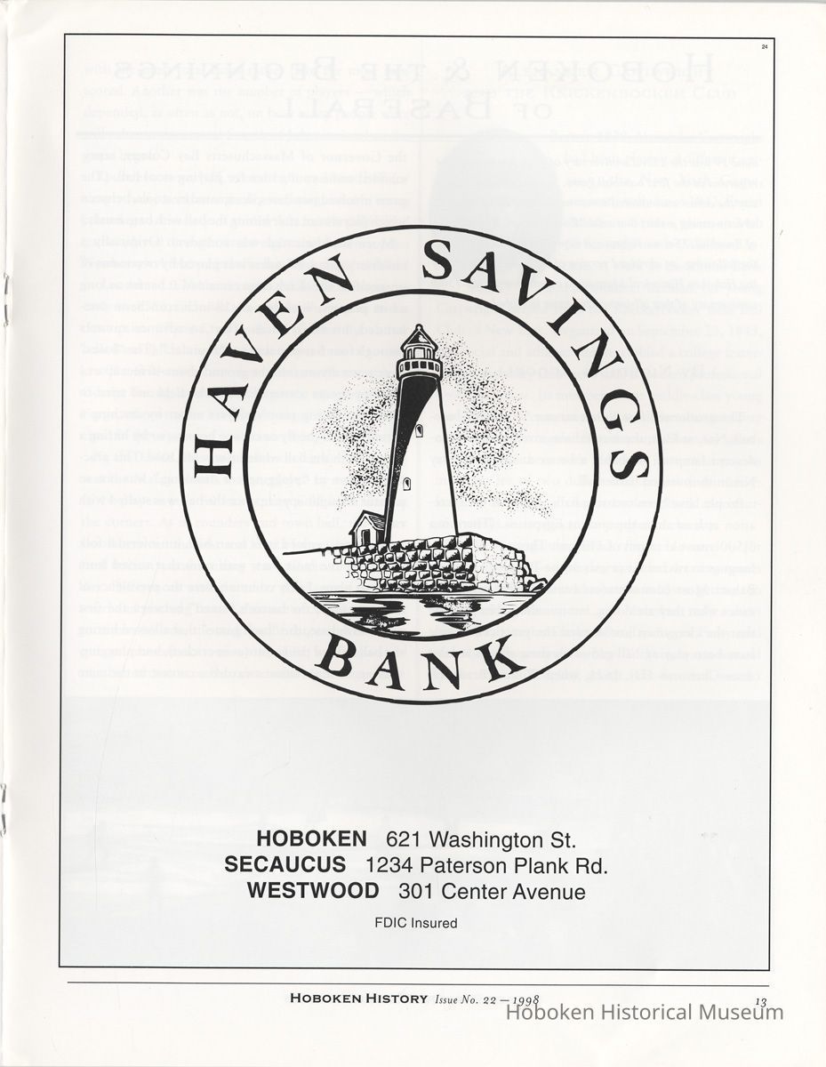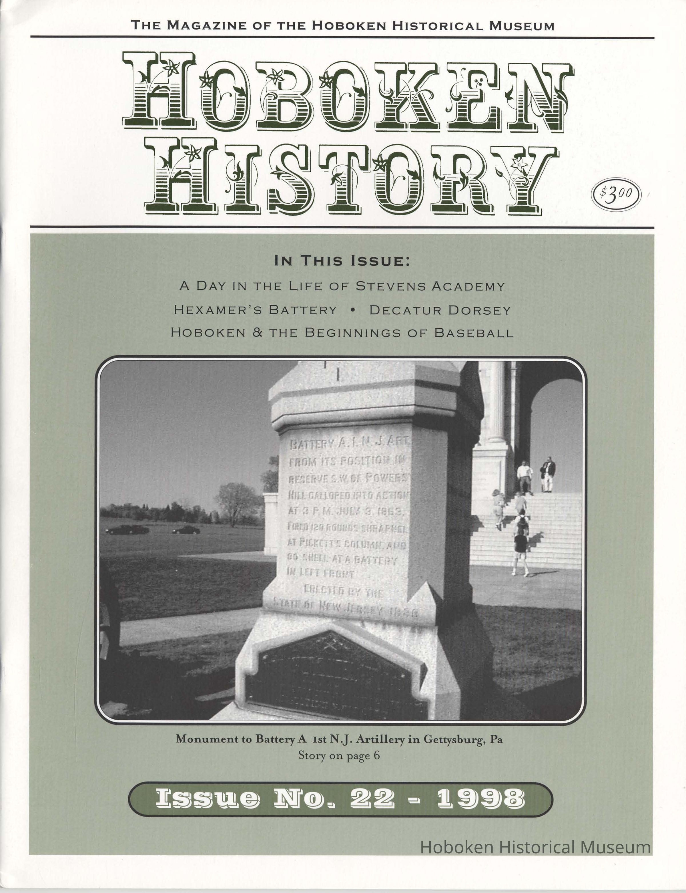 Hoboken History, Number 22, 1998. The Magazine of the Hoboken Historical Museum. Booklet. pp. 24 plus covers, illustrated. 8-3/8" wide x 11" high. 3 copies. PDF on file.