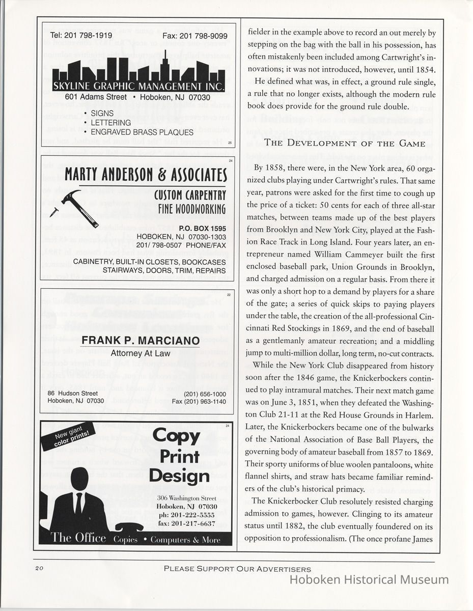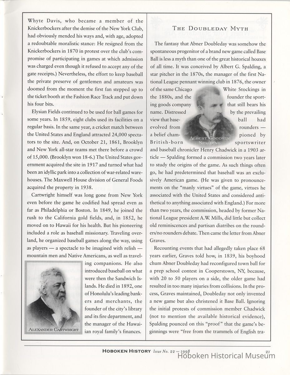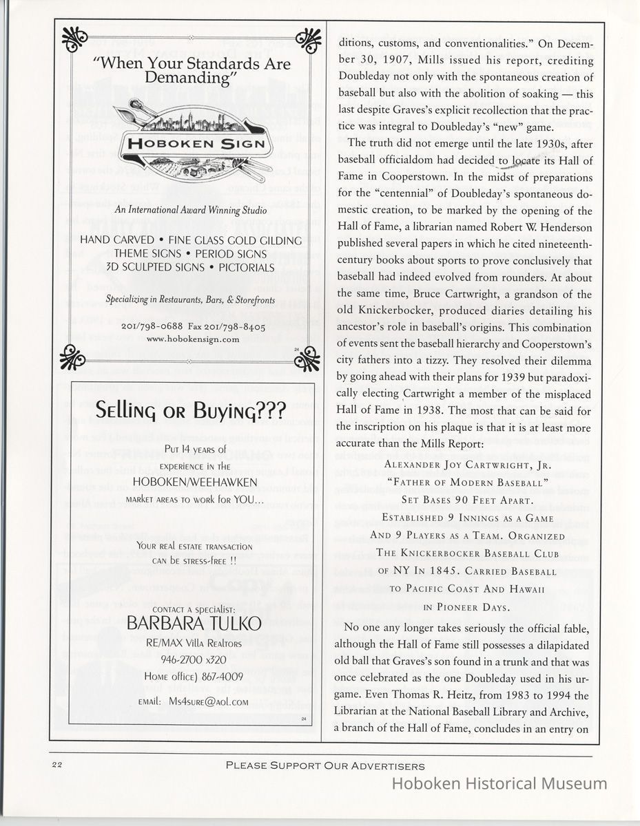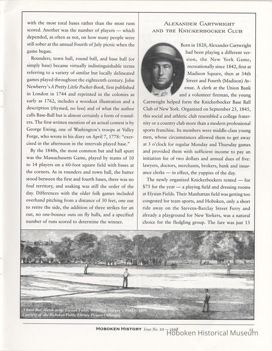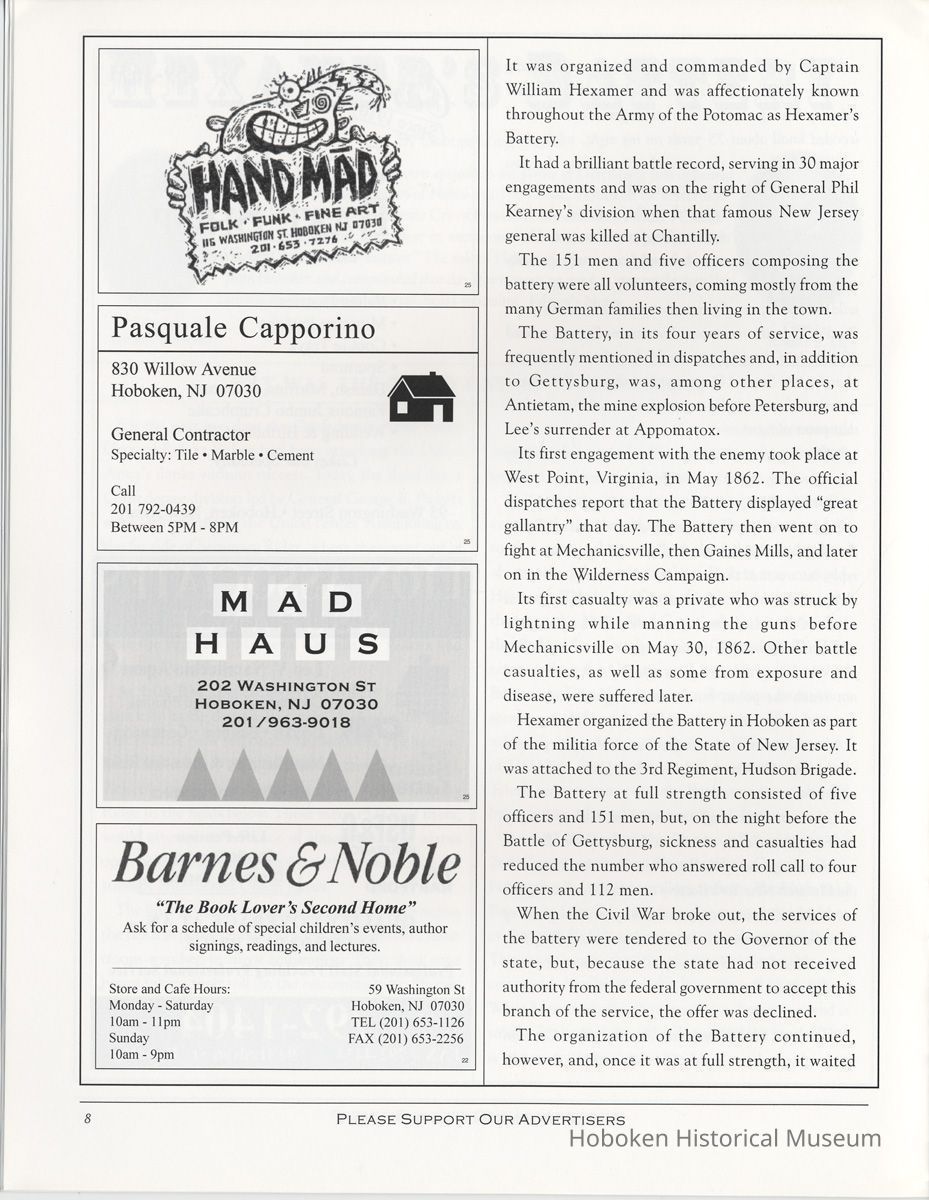 Hoboken History, Number 22, 1998. The Magazine of the Hoboken Historical Museum. Booklet. pp. 24 plus covers, illustrated. 8-3/8" wide x 11" high. 3 copies. PDF on file.