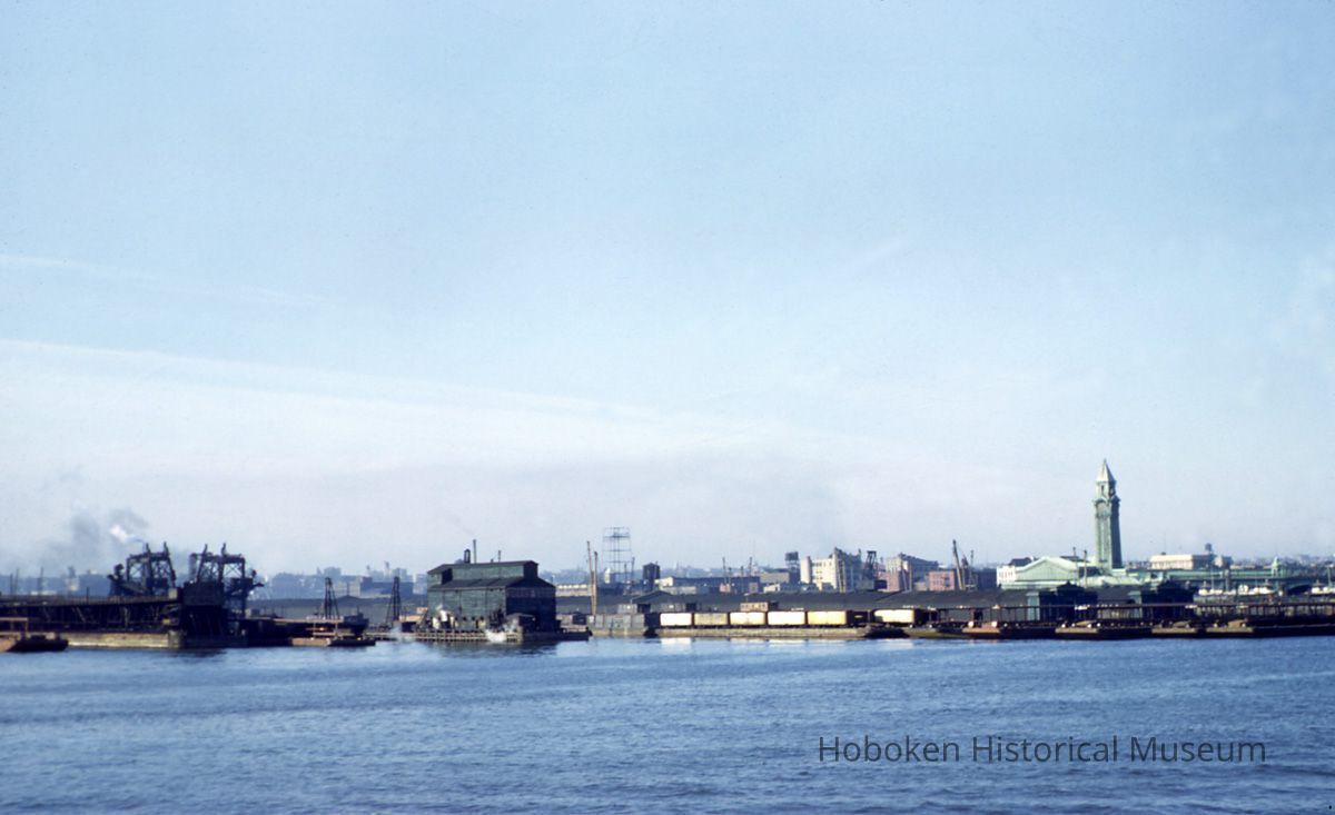 View is northwest with the Delaware, Lackawanna & Western Railroad terminal in Hoboken at the right. Notable is that the original clock tower of the 1907 terminal is still present. (It had deteriorated over the years and a 1950 storm damaged it such that it was removed soon thereafter; rebuilt in 2008.) Most of the scene is of the Erie Railroad yards just to the south in Jersey City (now the Newport development.)