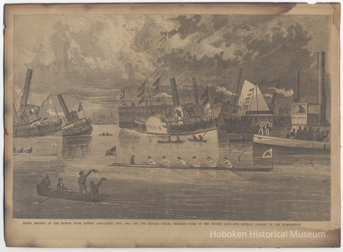 Print: Grand Regatta of the Hudson River Rowing Association; Sept. 10th, Off Elysian Fields, Hoboken - Close of the Fourth Race - The Mutuals Leading on the Homestretch. Probably issued by Frank Leslie's Illustrated Newspaper, September, 1868. Clipped leaf, mounted to matte board; darkened; stained. Image size is 9-1/8" high x 14-1/8" wide.