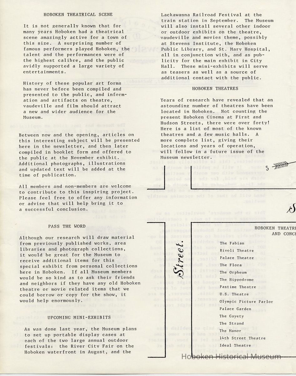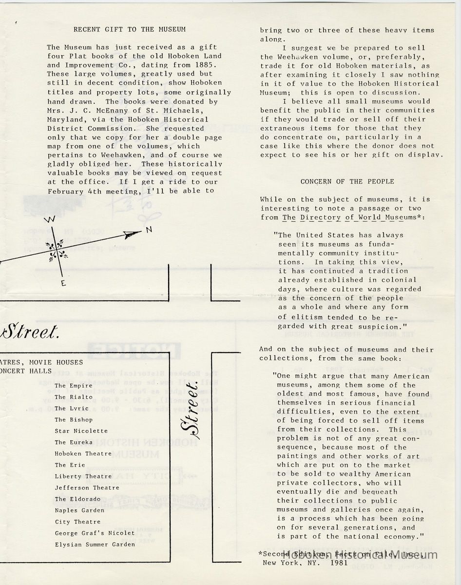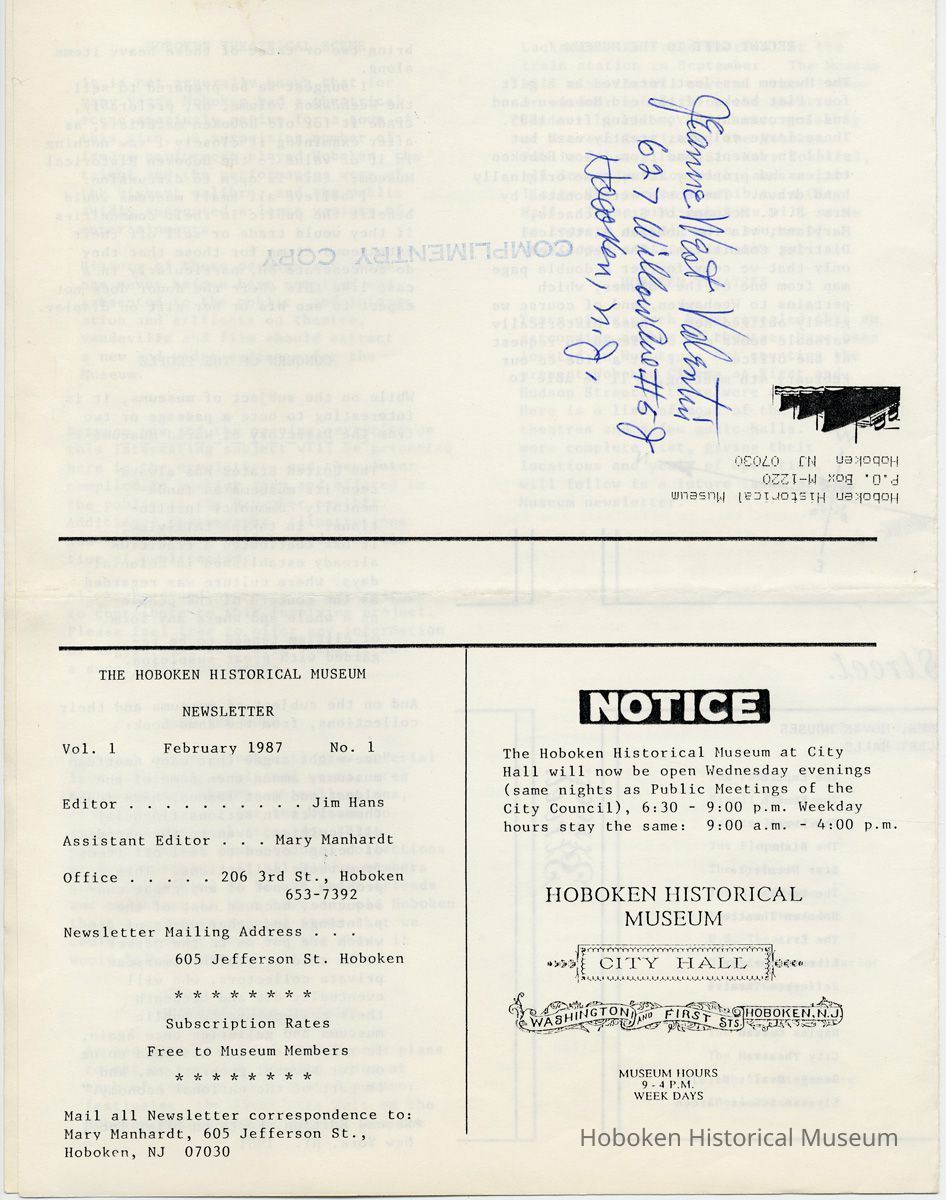 Hoboken Historical Museum Newsletter [First Series], Volume 1, No. 1, February 4, 1987. Pamphlet, 8-1/2" wide x 11" high. 4 pp., illustrated. 1 copy. PDF on file. (formerly belonging to Jean West Valentin, 627 Willow Ave. #5J, Hoboken.)