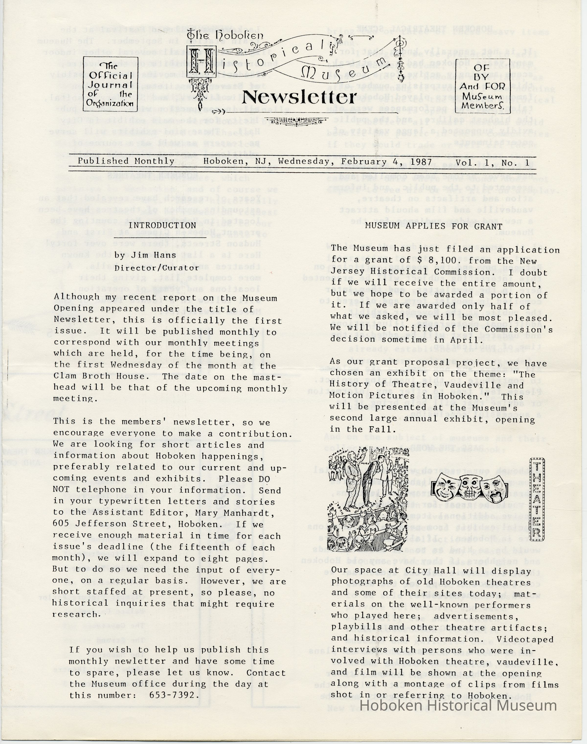 Hoboken Historical Museum Newsletter [First Series], Volume 1, No. 1, February 4, 1987.