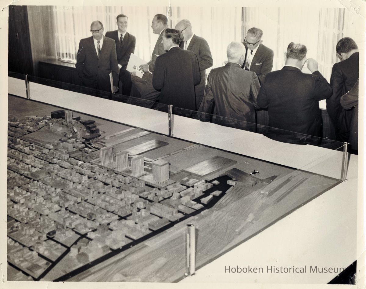 The location is not indicated, but probably on the campus of the Stevens Institute of Technology (the "students" who made it) and if so, possibly in the Stevens Center (new adminstration building.) Mostly the southeast part of Hoboken is seen with the Marineview Plaza (Grogan Towers) proposed development featured. None of the men are identified, but the fourth man from the right with white hair and back to the camera is probably Louis DePascale, then Mayor of Hoboken.