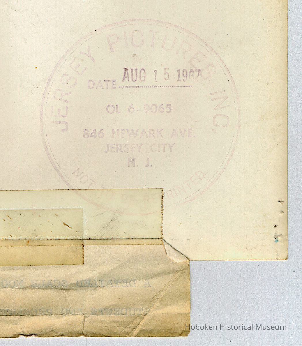 Digital image of black-and-white photo of Hoboken model with planned waterfront development, (Hoboken), August 15, 1967. Original: 8" x 10" print with typed caption attached at bottom. Photograph by Jersey City Pictures with their ink stamp on reverse with date. Source: S.C. Williams Library, Stevens Institute of Techology. Tiffs media archive.