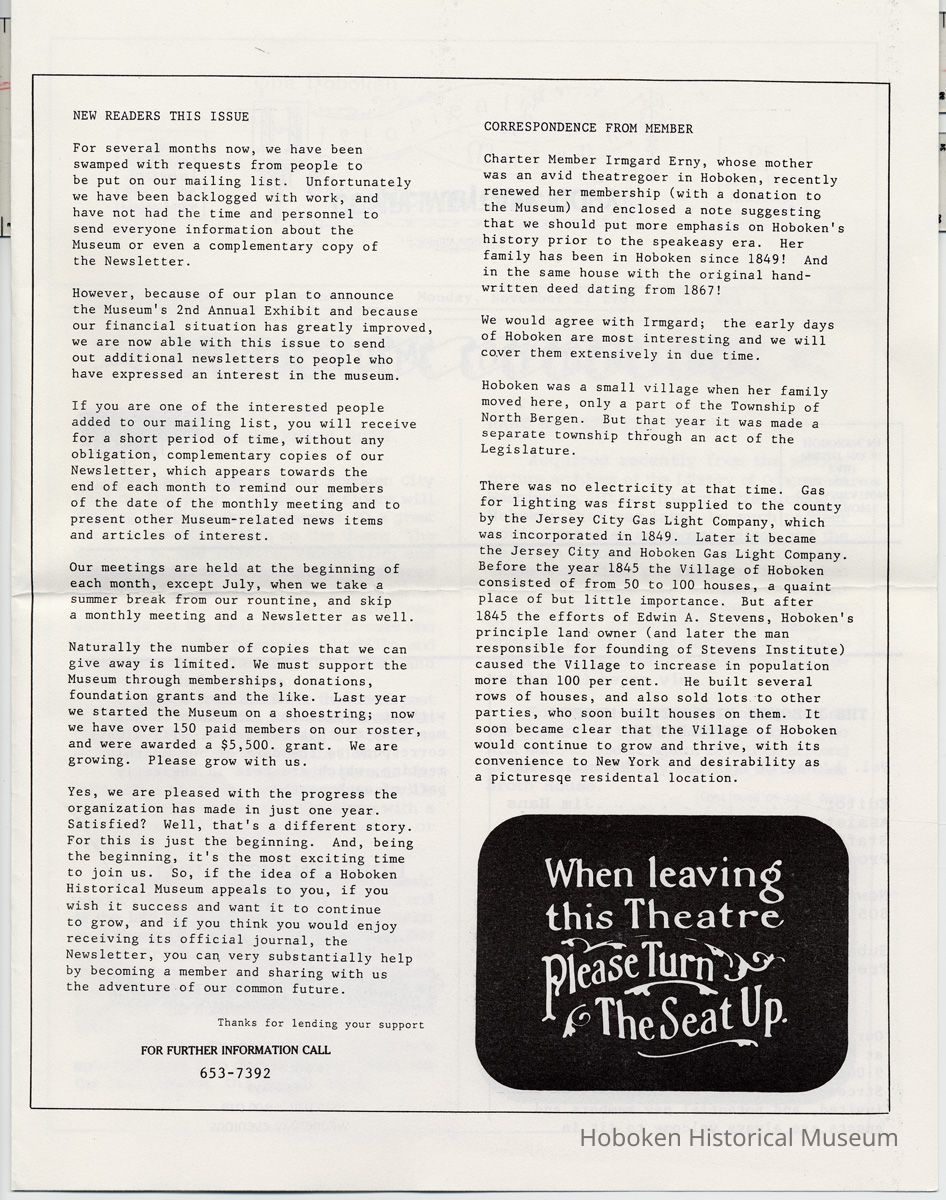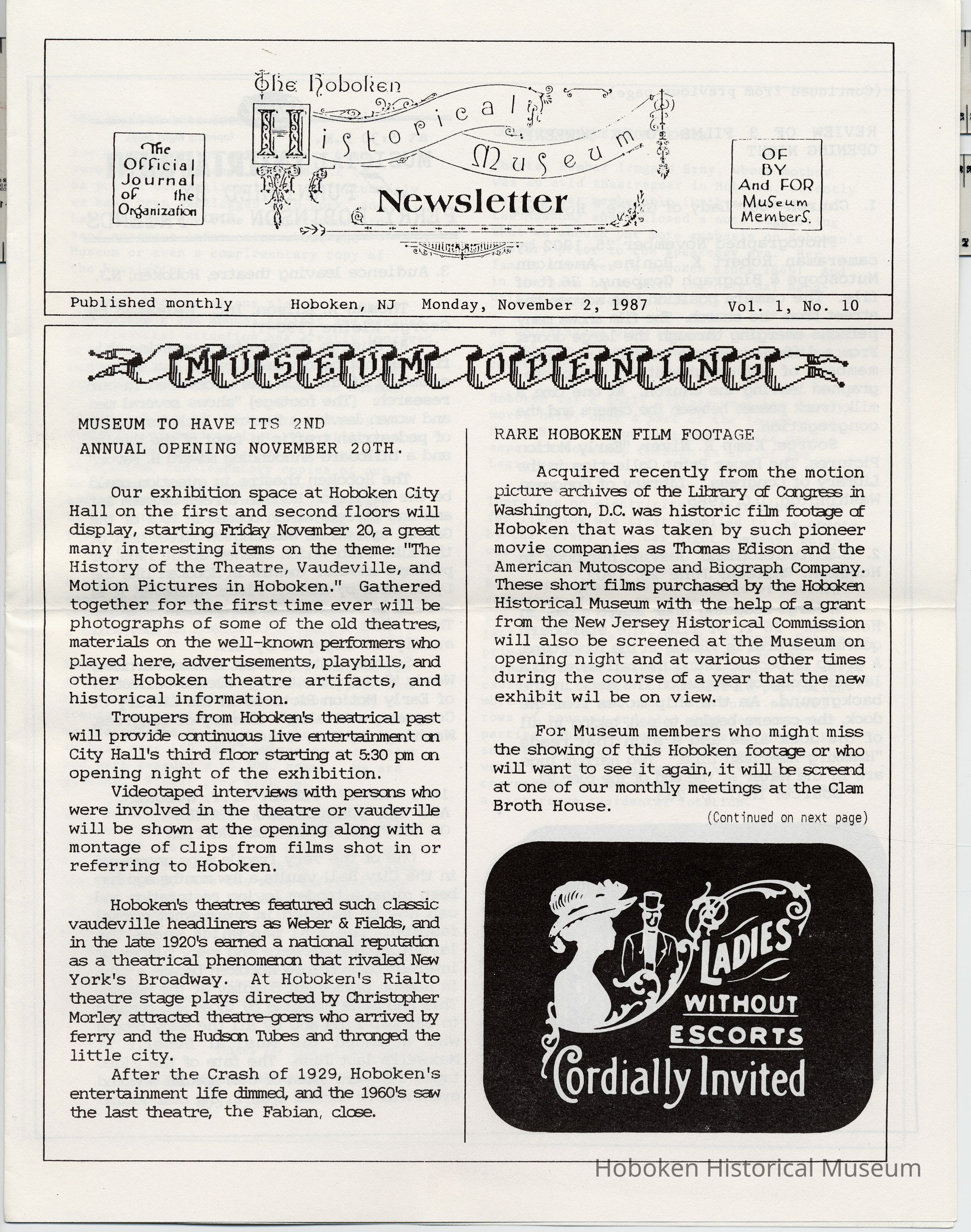 Hoboken Historical Museum Newsletter [First Series], Volume 1, No. 10, November 2, 1987.
