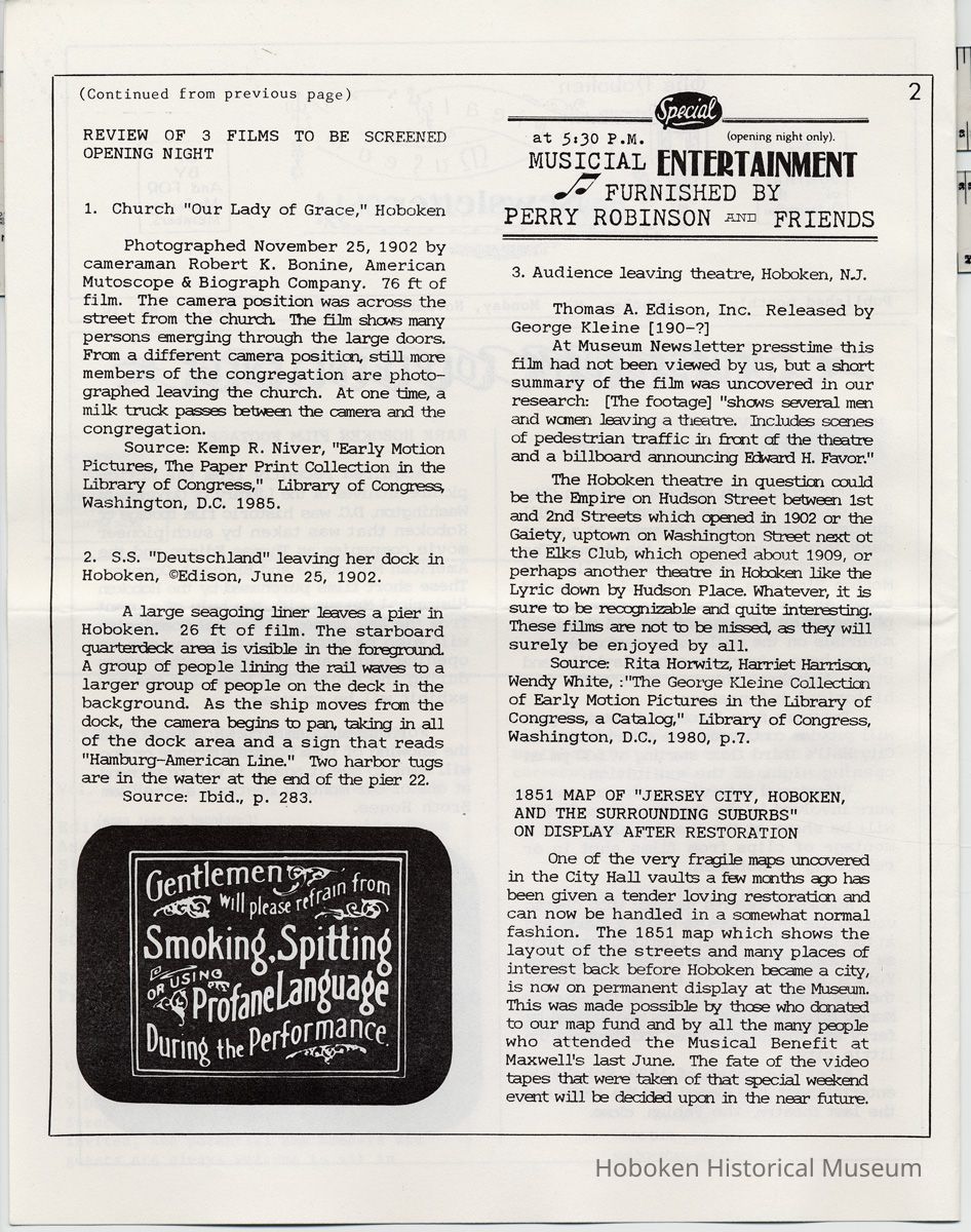 Hoboken Historical Museum Newsletter [First Series], Volume 1, No. 10, November 2, 1987. Pamphlet, 8-1/2" wide x 11" high. 4 pp., illustrated. 6 copies. PDF on file.