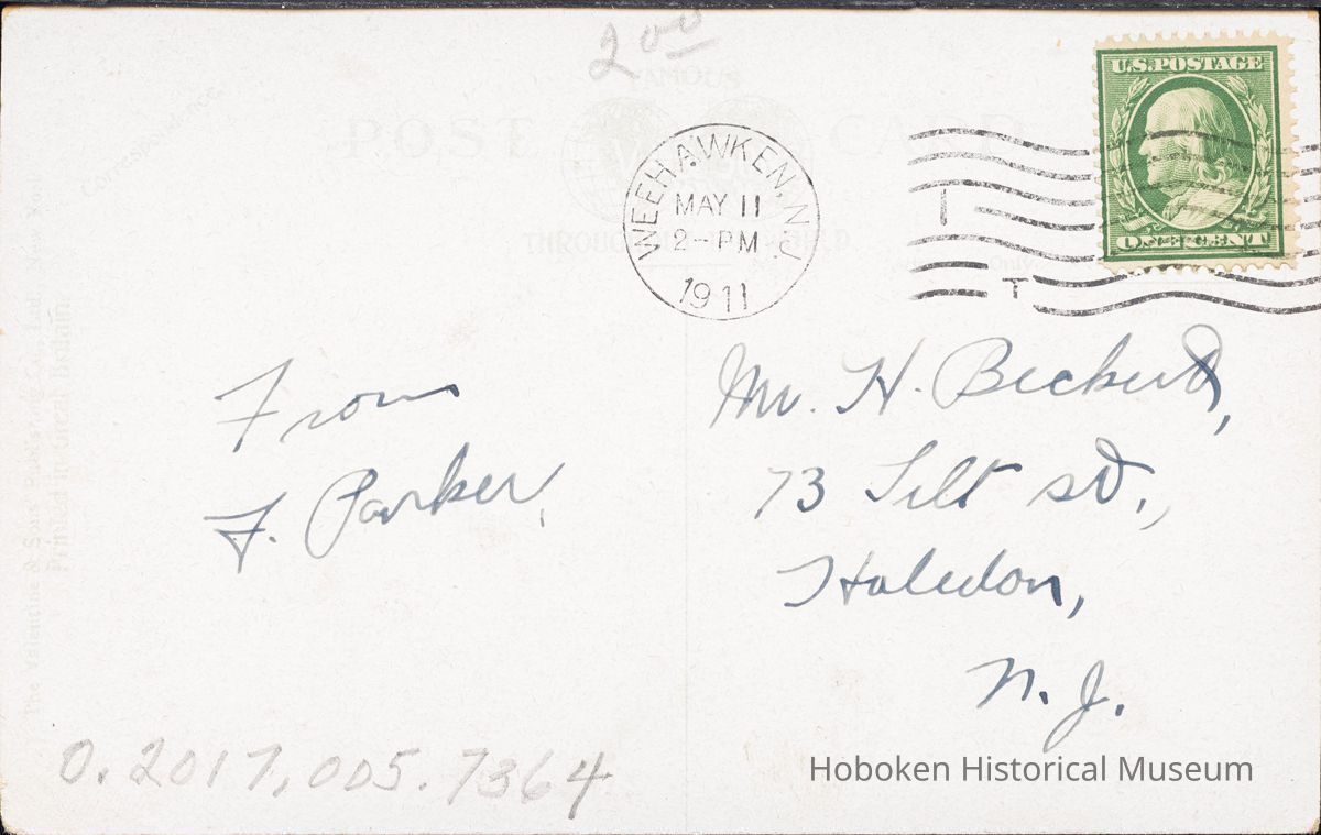 Postcard: Turn Verein, cor. Lewis and New York Avenue, Union, Hill, NJ Postmarked May 11, 1911 Colorized 3 1/2 x 5 1/2"