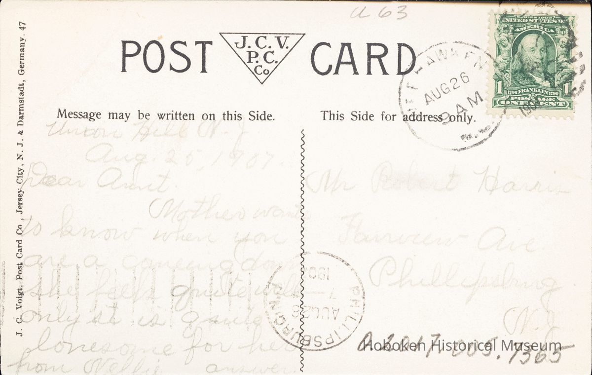 Postcard: Headquarters of the Tur Verein, Union Hill, NJ Postmarked Aug 26, 19?? 3 1/2 x 8 1/2"