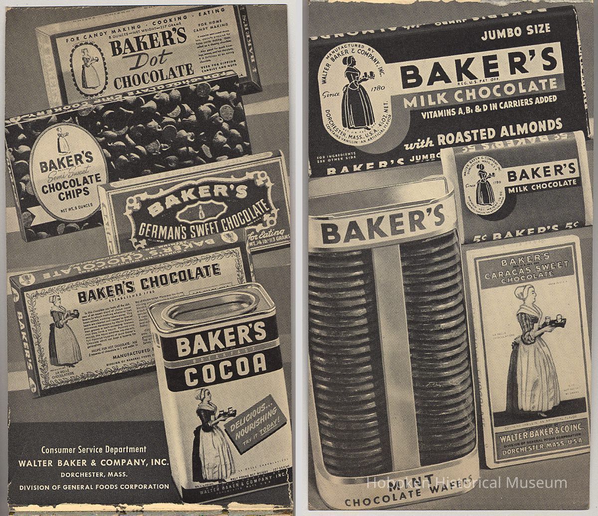A recipe book for the several types of chocolate made by this company. Baker's Coconut, which was made in Hoboken at the time of publication, is among the other General Foods products found in the recipes. It was made in two types, Premium Shred and Southern Style, by the Franklin Baker Division of General Foods. (Baker's Chocolate and Baker's Coconut shared the name Baker, but were separate divisions.)