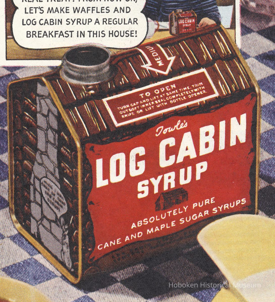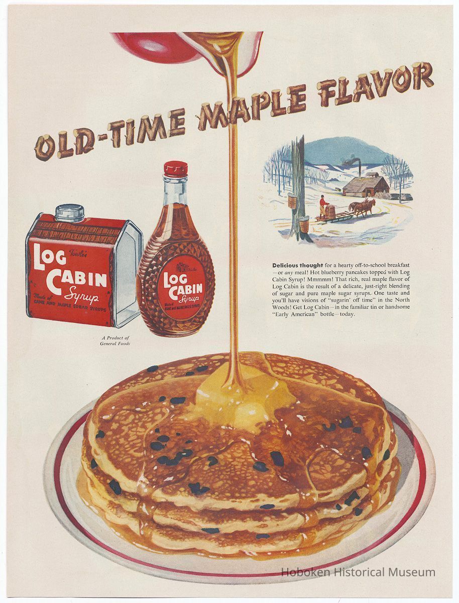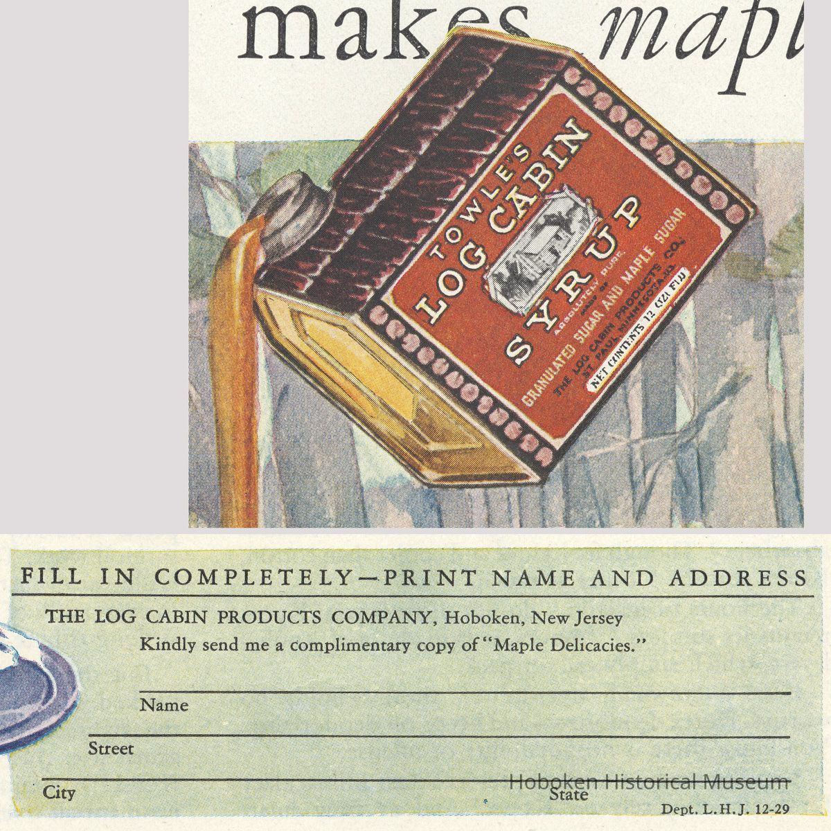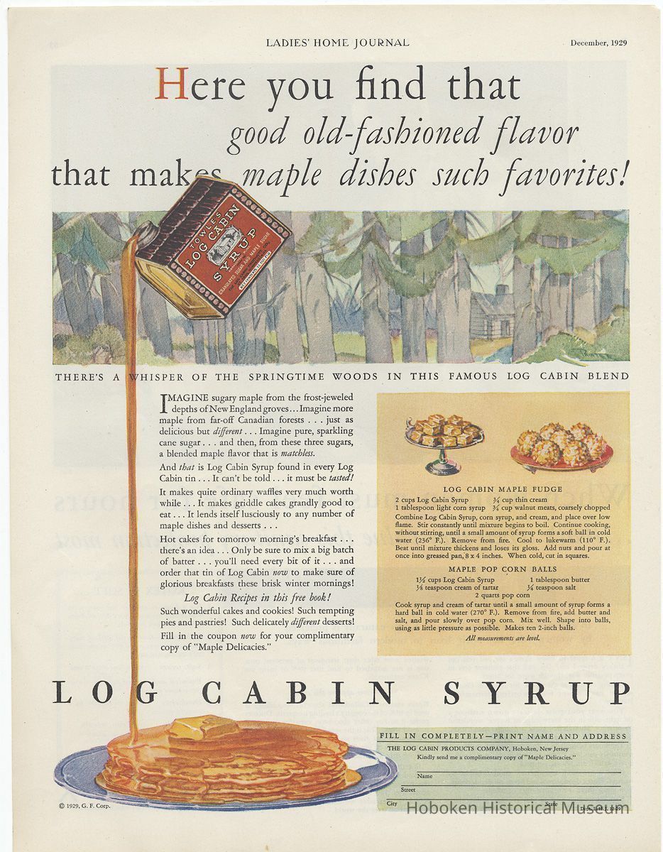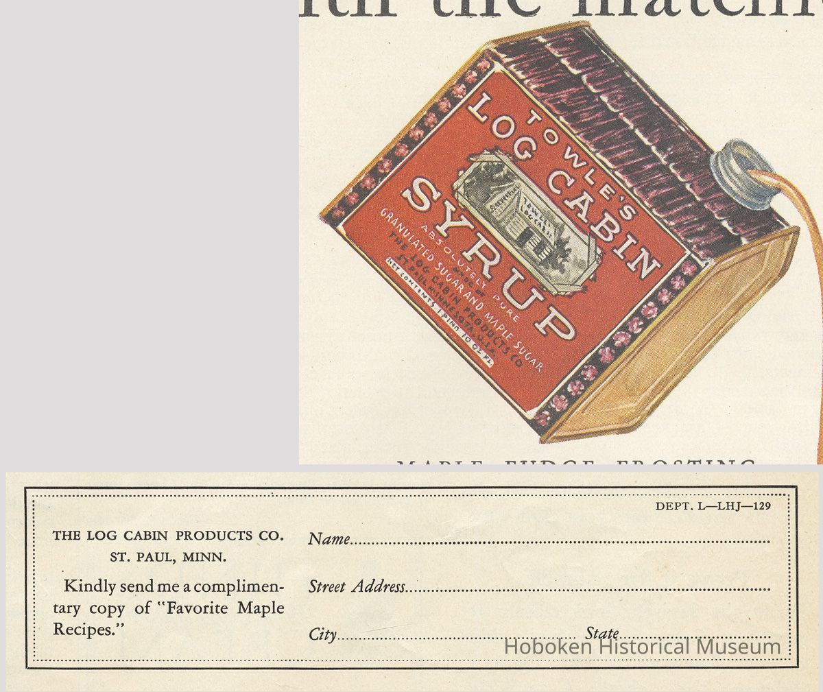 Ad 1: Ladies Home Journal, January 1929, page [39]; 10-1/2" x 13-5/8" high. Can depicted has the St. Paul, Minn. location for The Log Cabin Products Co. A request coupon printed at the lower right for a free copy of "Favorite Maple Recipes" also has the same name and address. While Hoboken is not mentioned, this ad helps with timeline of the company's transfer of operations to Hoboken as is seen in ad 2.