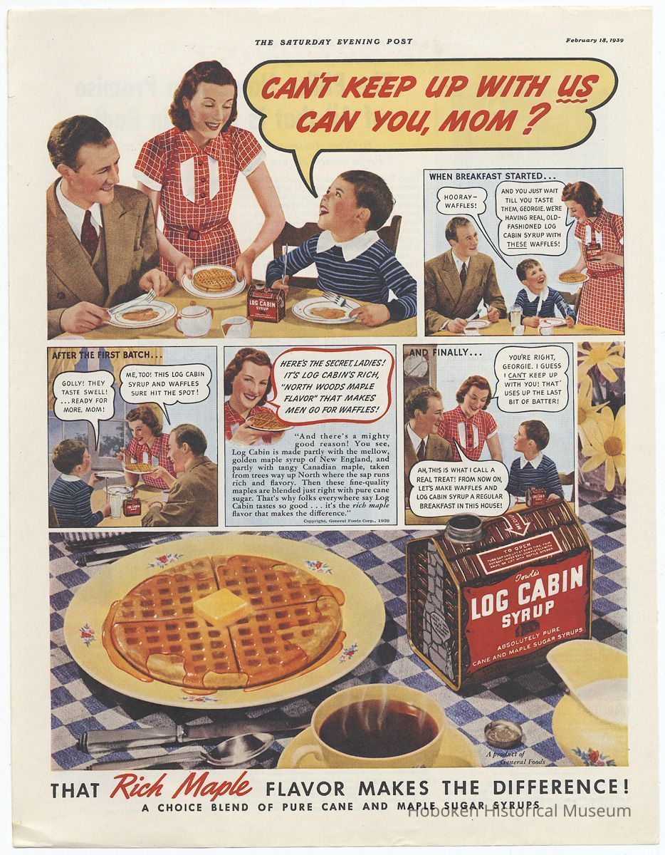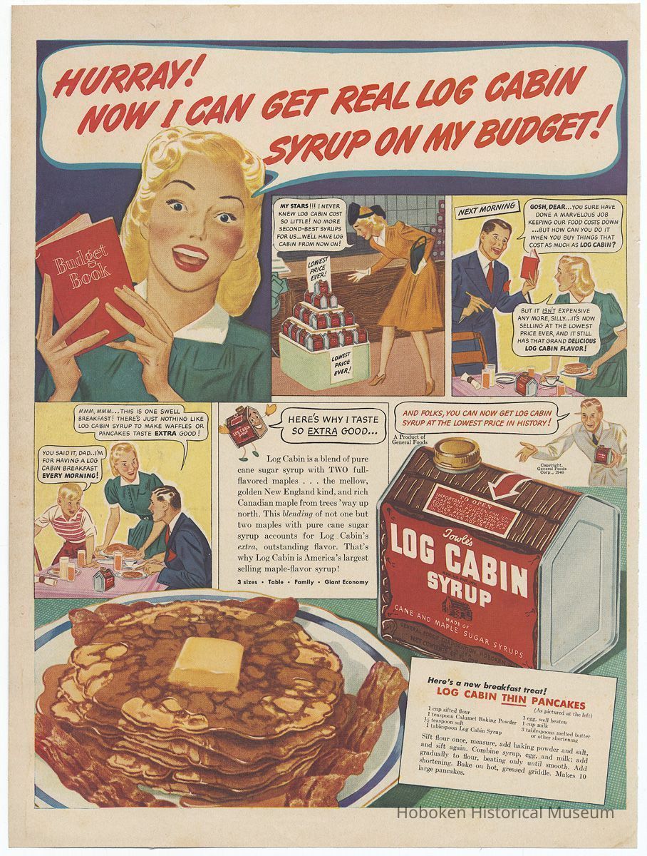 Ad, Log Cabin Syrup: magazine ads, 6, by Log Cabin Products Co.; General Foods Corp., 1929-early 1950s.