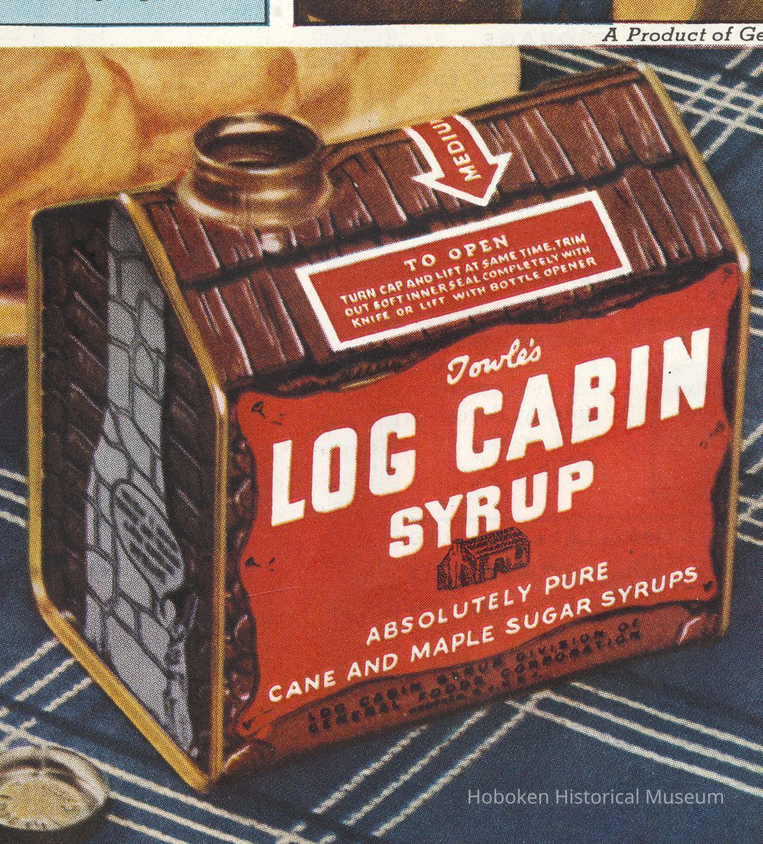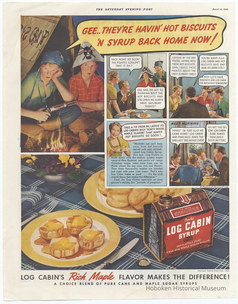 Ad 4: The Saturday Evening Post, April 15, 1939, page [4]; 10-1/2" x 13-1/2" high. Can does have legible text printed near the bottom: Log Cabin Syrup Division of General Foods Corporation, Hoboken, N.J., U.S.A.