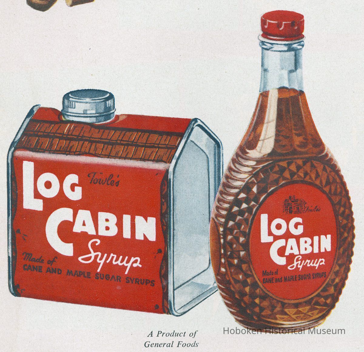 Product's full name was Towle's Log Cabin Syrup. The syrup itself was made in Hoboken starting in 1928 or 1929 as the Log Cabin Products Division of the General Foods Corporation (but note that one ad has a can marked Log Cabin Syrup Division). Notable are the depictions of the distinctive log cabin shaped can and the changing graphics seen. Detail views of containers are shown from each ad.