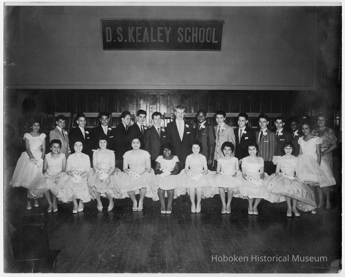 Sepia tone photo of the Class of 1959, Daniel S. Kealey School, Hoboken, ca. June 17, 1959. Digital image only; original 8" x 10", reverse was blank. Photograph taken by DePascale Studio [Union City, N.J.]