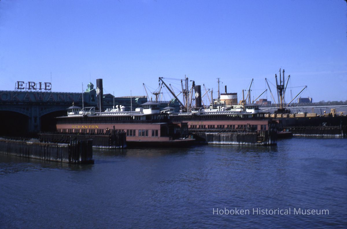 Color photograph of the Erie-Lackawanna ferries Scranton and Elmira at the Erie-Lackawanna Terminal, Hoboken, May 1967. Mounted 35mm Kodachrome; ink stamped "The Houser Collection"; processor's date May 67N19; holographic ink notes. Photographer was Charles Houser [Sr.]