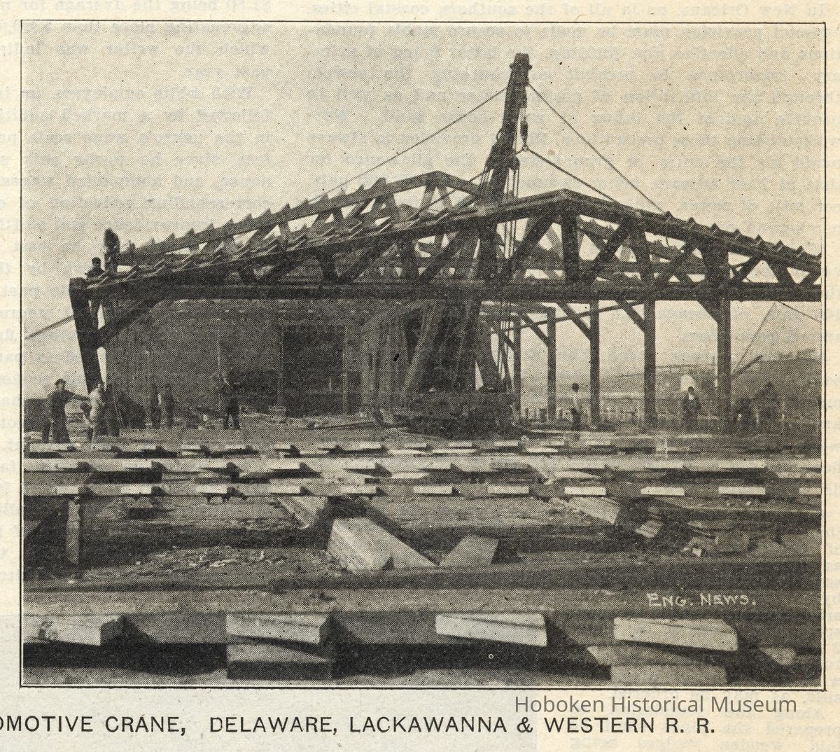 Notes: Transcription of article on page 296, column 1 of Engineering News, Vol. LIV, No. 12, Sept. 21, 1905. Archives 2010.007.0210. RAPID ERECTION OF PIER SHED FRAME, DELAWARE, LACKAWANNA & WESTERN R. R. Unusually rapid work was recently accomplished in erecting the framework of two pier sheds for the Delaware, Lackawanna & Western R. R. at Hoboken, N. J. The work referred to comprises two parallel sheds, each 1,700 ft. long, with depressed tracks between. The sheds are located on timber pile piers and are of wooden frame construction, the covering being corrugated iron. As a measure of protection against Are each shed is divided transversely by three concrete fire walls. The pier is wide enough to give external platforms to the sheds, and in these platforms are openings for ramps leading to horizontal folding side doors. The rapid erection work spoken of refers only to the timber framework. As shown in the illustrations, the framework consists of simple roof trusses carried on end posts, or wall columns, and connected by wall stringers and purlins. All the truss and end port bents were framed and assembled complete before erection was begun. The wall stringers and purlins were also framed ready to be assembled with the bents. The next step was to lay the bents flat on the pier with the feet of the posts on the spots they were to occupy when set upright, the wall stringers were also laid on the pier floor alongside the positions they were to occupy. The accompanying views show this lay-out quite clearly. When the lay-out was completed as shown erection began. A locomotive crane was run out on a track extending longitudinally of the shed at the center. This crane picked up the first bent and tilted it upright where it was shoved in position. As the bent was fitted two men standing in the knee braces at the corners rode up on it and remained. The second bent was then tilted up with two other passengers, and shored. The crane then cast loose and picked up the wall stringers, swinging them into position to be connected up by the men who had ridden up on the bents. As soon as the stringers had been placed the crane backed up so that its lowered boom, when swung to one side, would pass under the erected truss; it then advanced to the position for tilting up a third bent, which was connected up like the second. The two pairs of top men alternated in riding the bents. In fact the position and duty of each workman and the maneuvers of the crane were regulated with military precision. To this was due largely the rapidity of the work. The average time from attaching the crane ropes to one truss to attaching them to the next following was 15 minutes, and in some cases this time was less than five minutes. In the case of the second shed erected, the whole 1,700 ft. of bents were placed in between 16 to 20 working hours. The two sheds were erected at different times and the plan described was conceived by Mr. J. E. Snell, Superintendent of Buildings and Docks, Delaware, Lackawanna & Western R.R. and afterwards used by Mr. Henry Steers in erecting the second shed. [caption for two photos across center of page: METHOD OF ERECTING PIER SHED FRAMEWORK WITH LOCOMOTIVE CRANE, DELAWARE, LACKAWANNA & WESTERN R.R.] Status: OK Status By: dw Status Date: 2010-10-19
