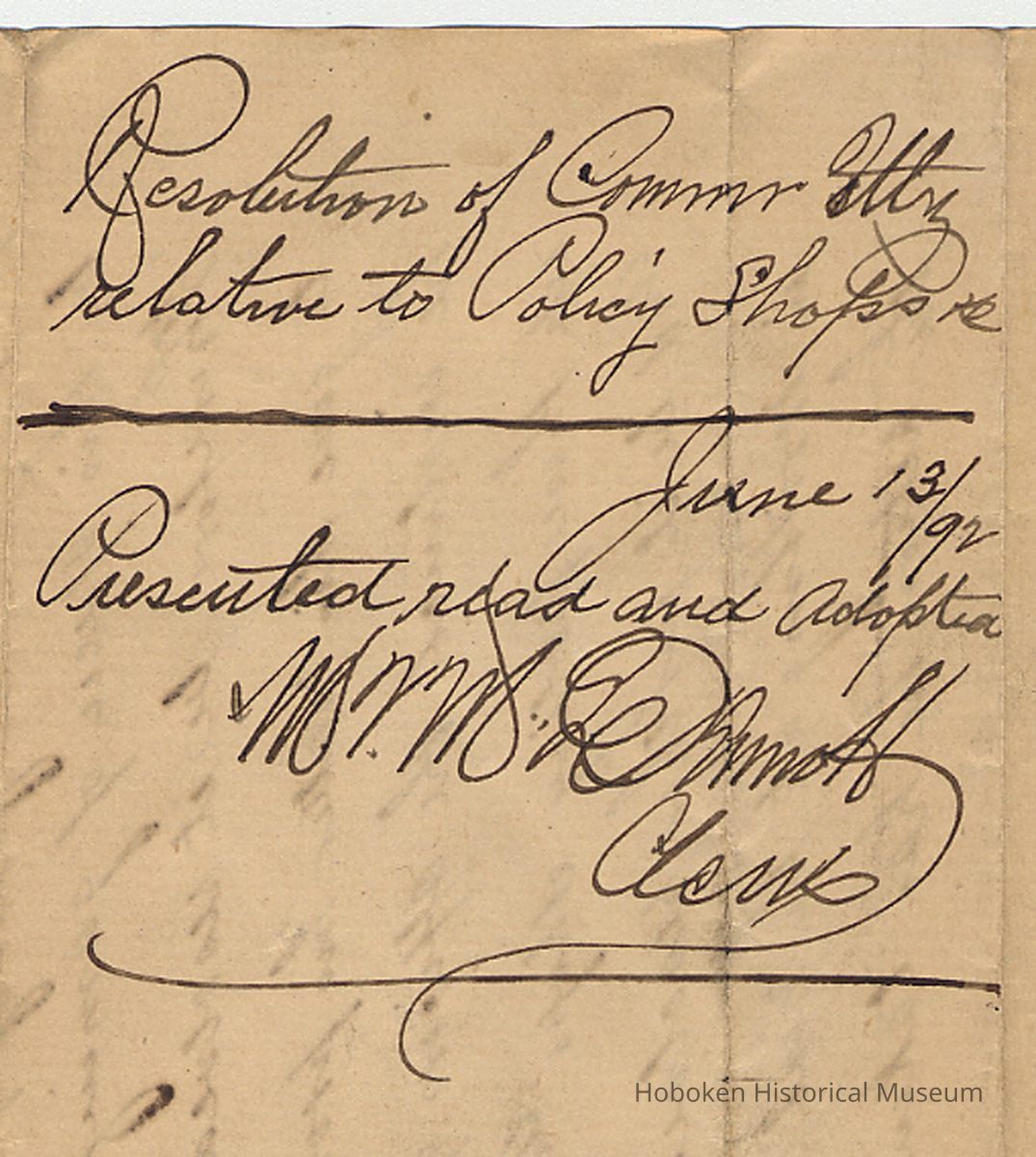 Resolution re Policy Shops, Bd. of Police Commissioners, Hoboken, June 13, 1892.