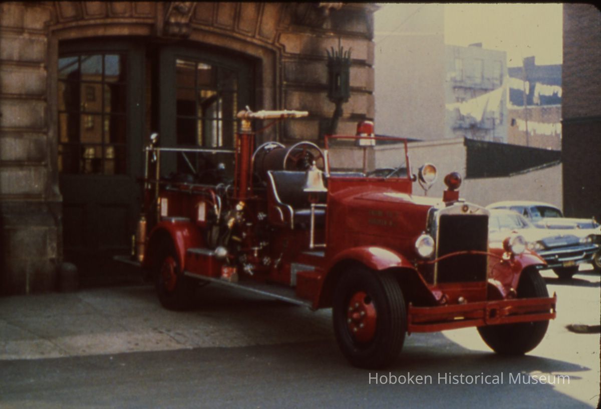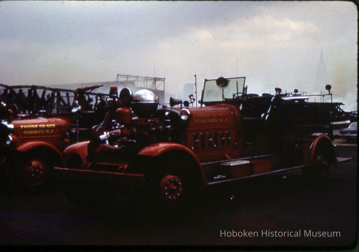 Four color slide transparencies of Hoboken Fire Department fire trucks, 1975-1982.