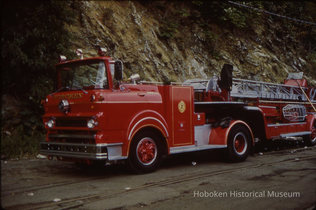 View of ladder truck no. 2 parked on west side of River Road probably between 9th and 10th Streets near the Pennsylvania Railroad's Marine Division piers in Hoboken on River Road about 10th St.