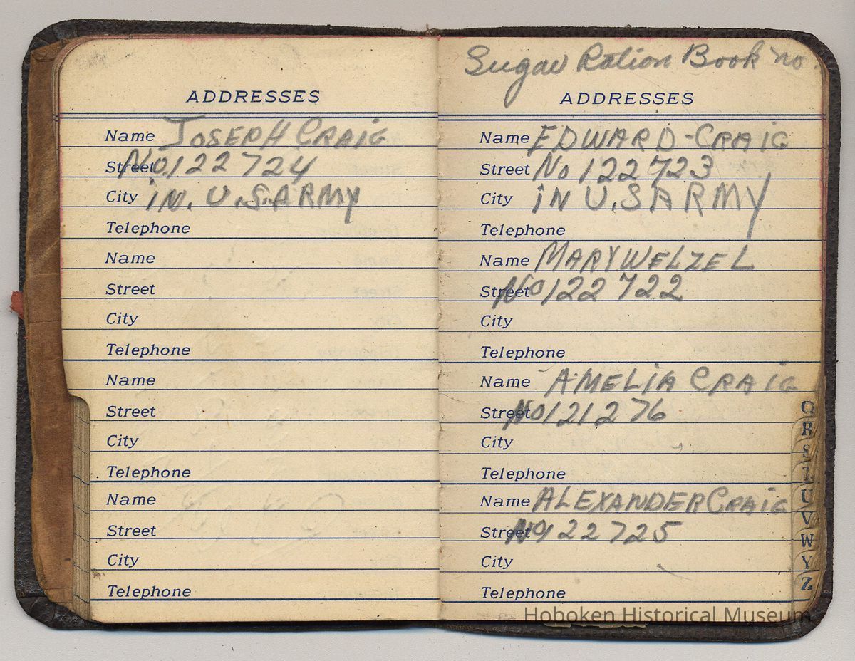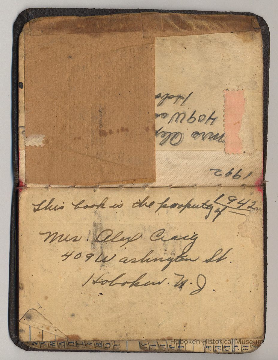 Address book from 1942-1944 belonging to Mrs. Alex [Amelia] Craig, 409 Washington St., Hoboken.