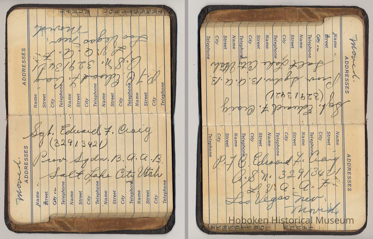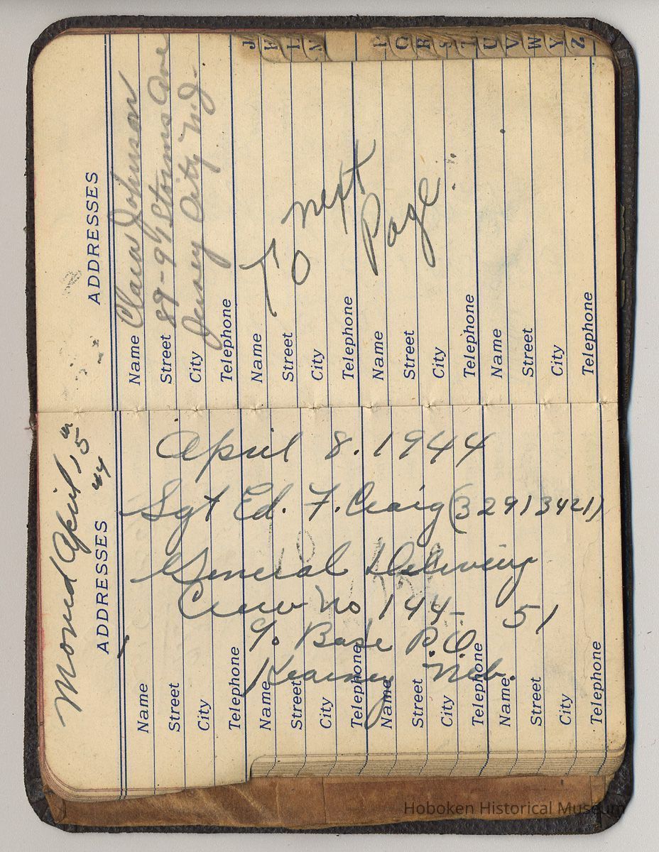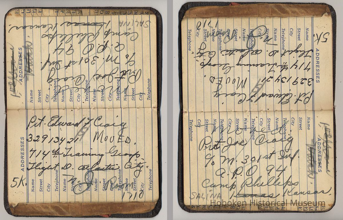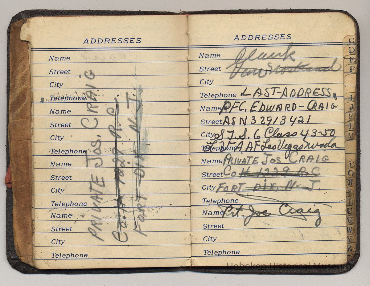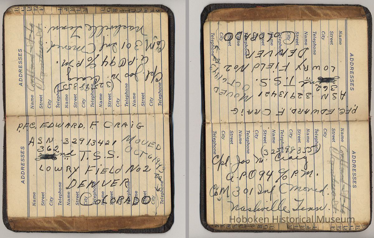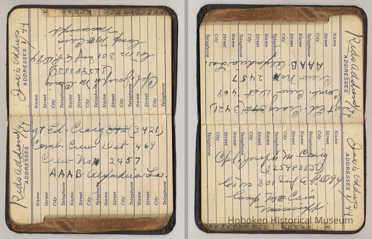Address book belonging to Mrs. Alex [Amelia] Craig, 409 Washington St., Hoboken, 1942-1944.