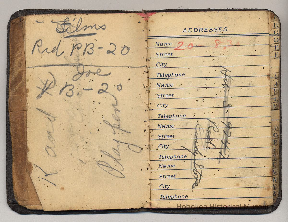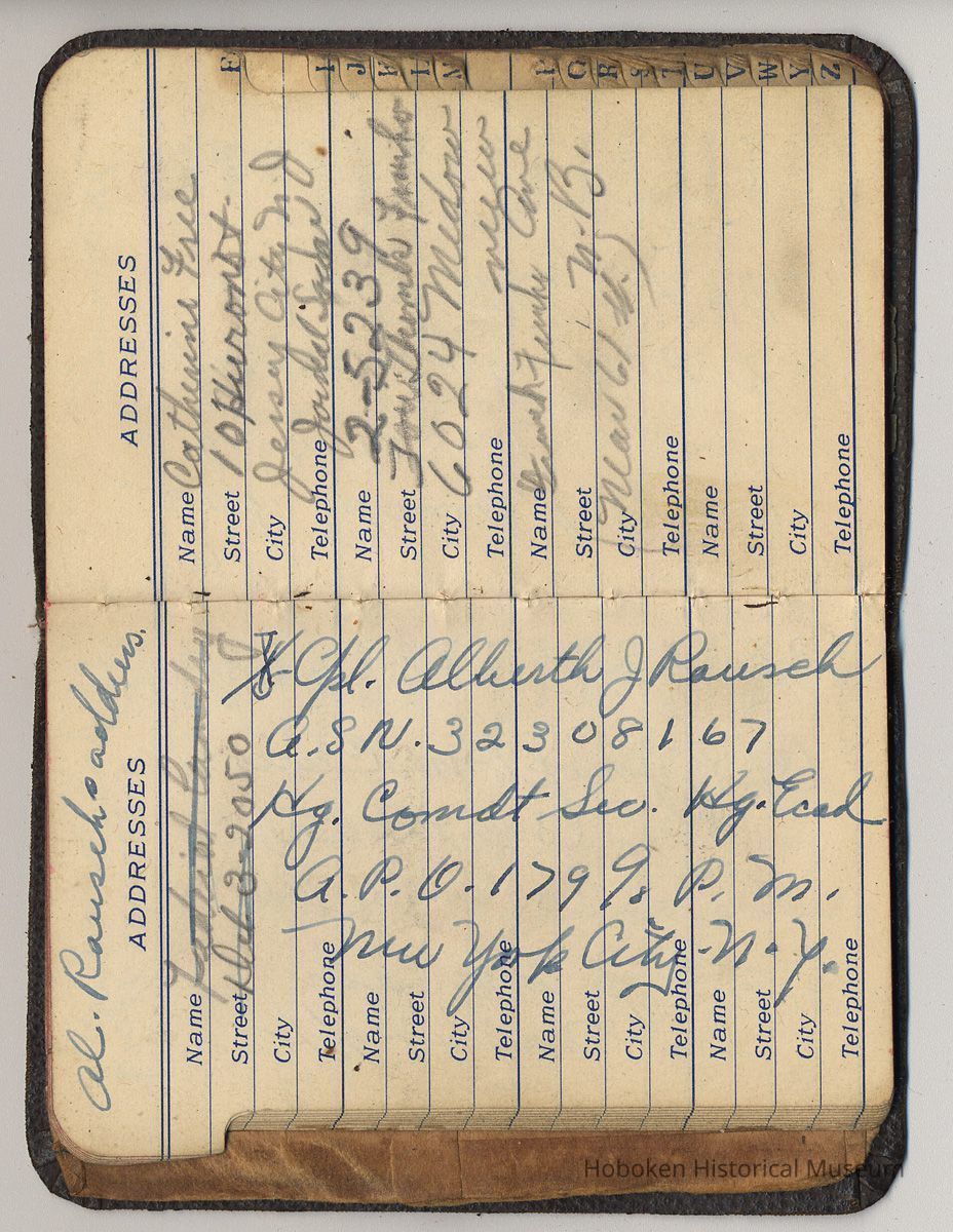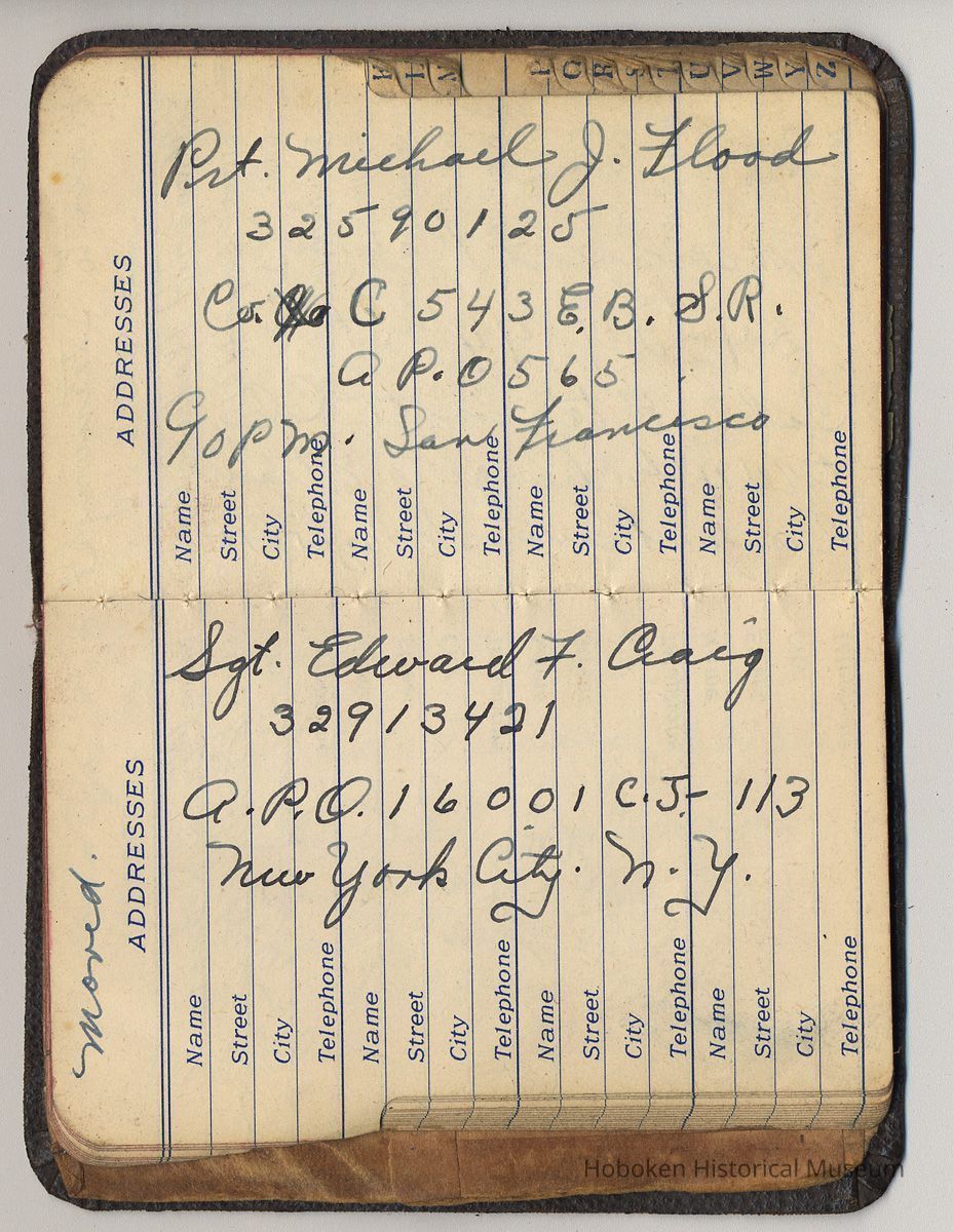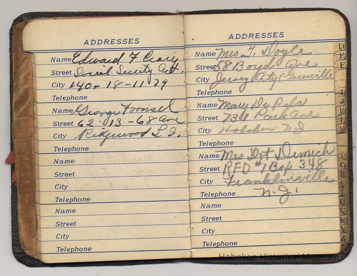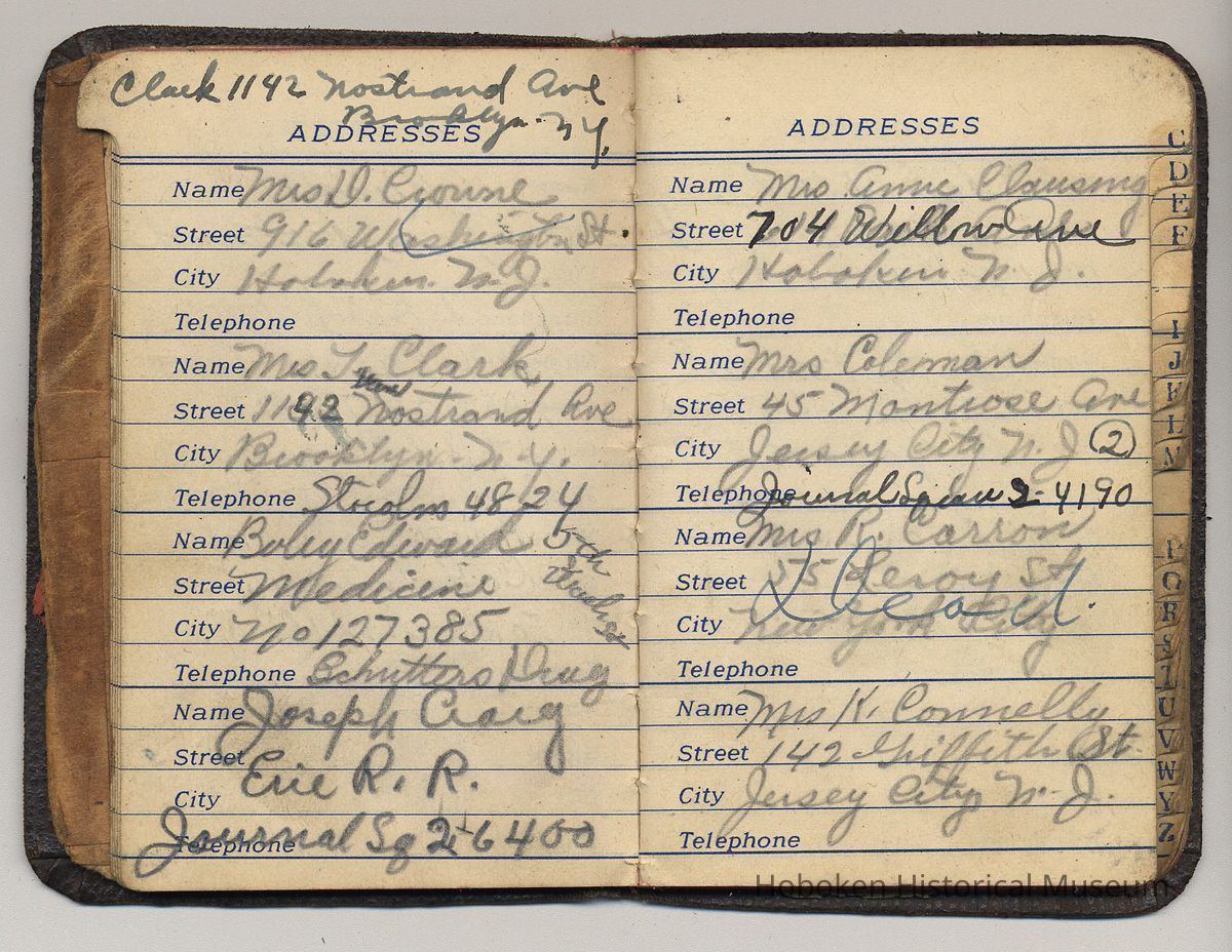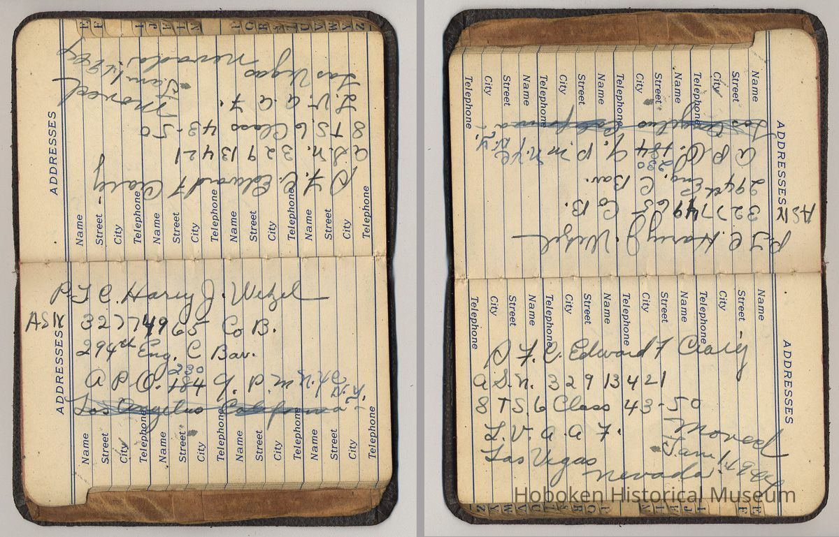 Address book belonging to Mrs. Alex [Amelia] Craig, 409 Washington St., Hoboken, 1942-1944.