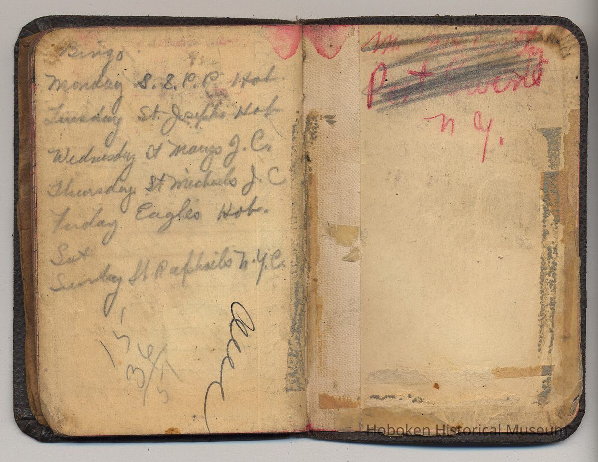At the back she kept her handwritten schedule of bingo nights at churches and 1 fraternal society; of the six listed, three are in Hoboken, 2 in Jersey City and one in New York City. Only Saturday night did not have listed venue.