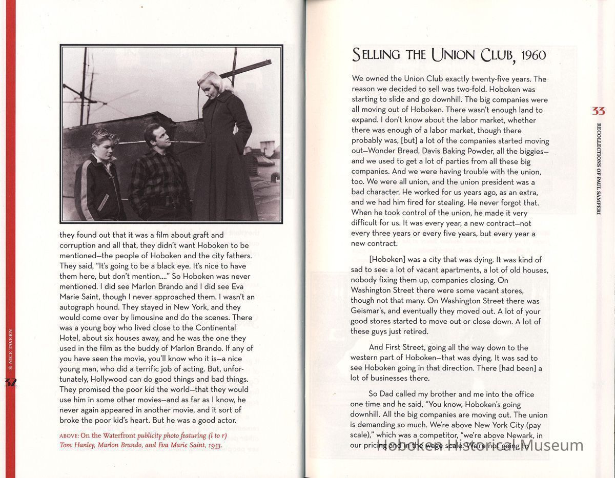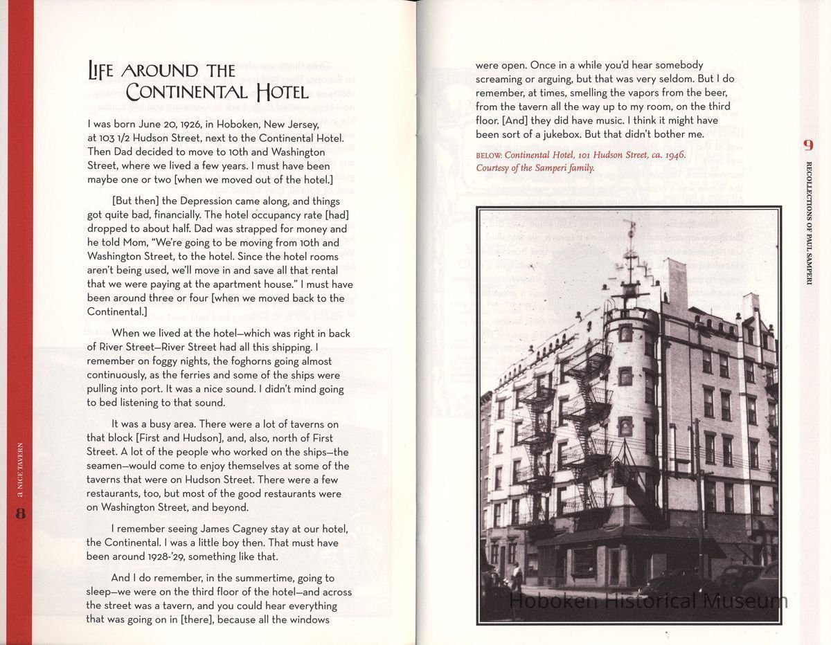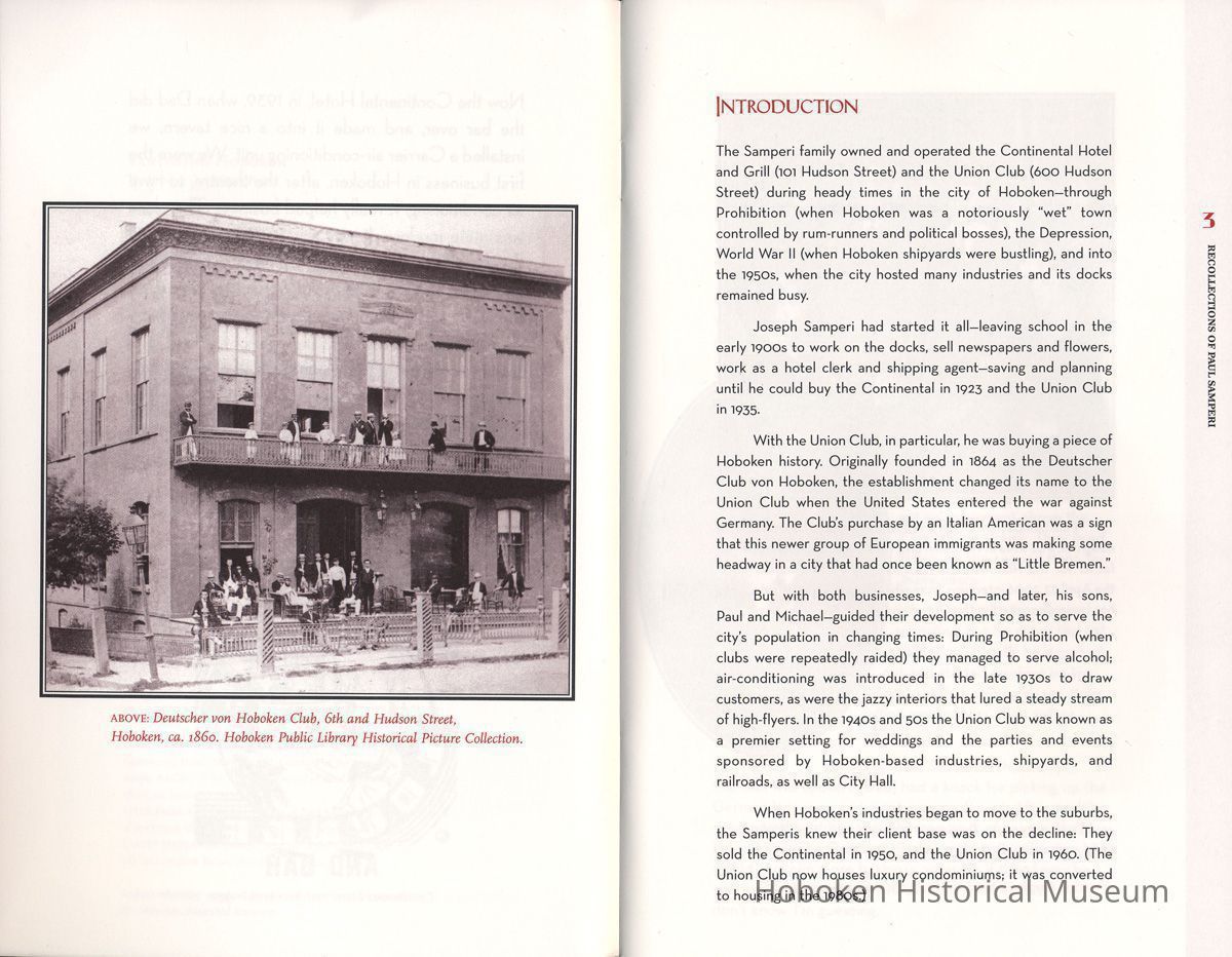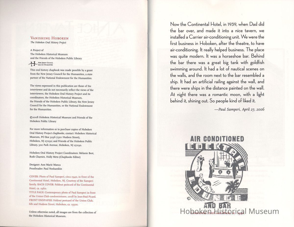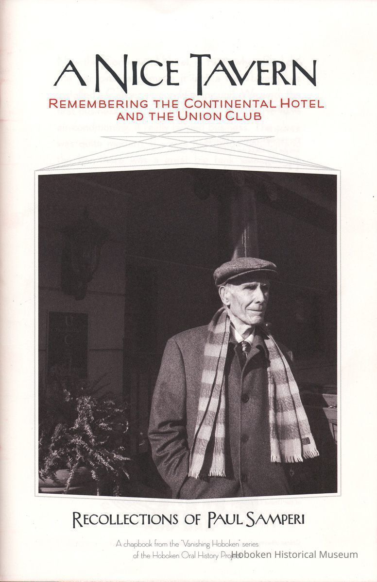 A Nice Tavern: Remembering the Continental Hotel and the Union Club. Recollections of Paul Samperi. Hoboken: The Hoboken Oral History Project, 2008. 1st edition thus. 8vo booklet, illustrated, pp. [ii], 38 plus cover. Ten copies.