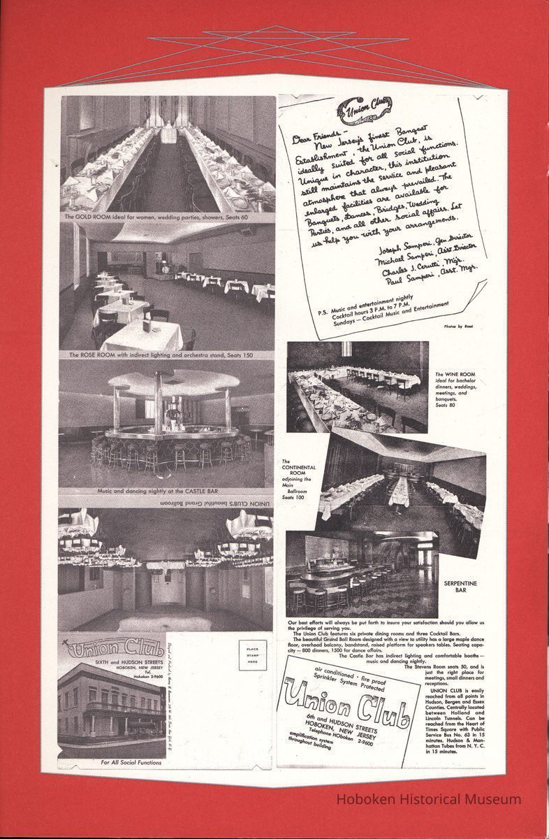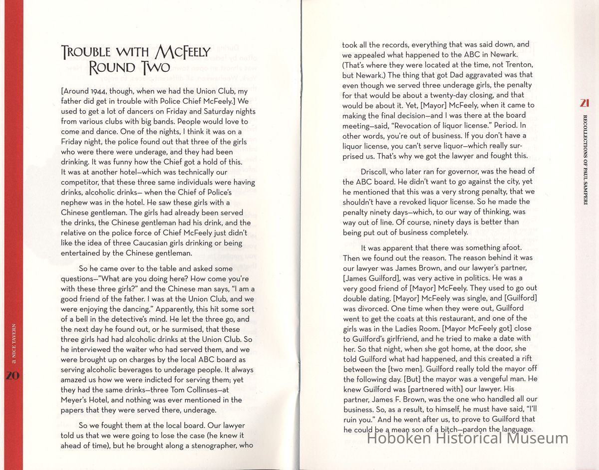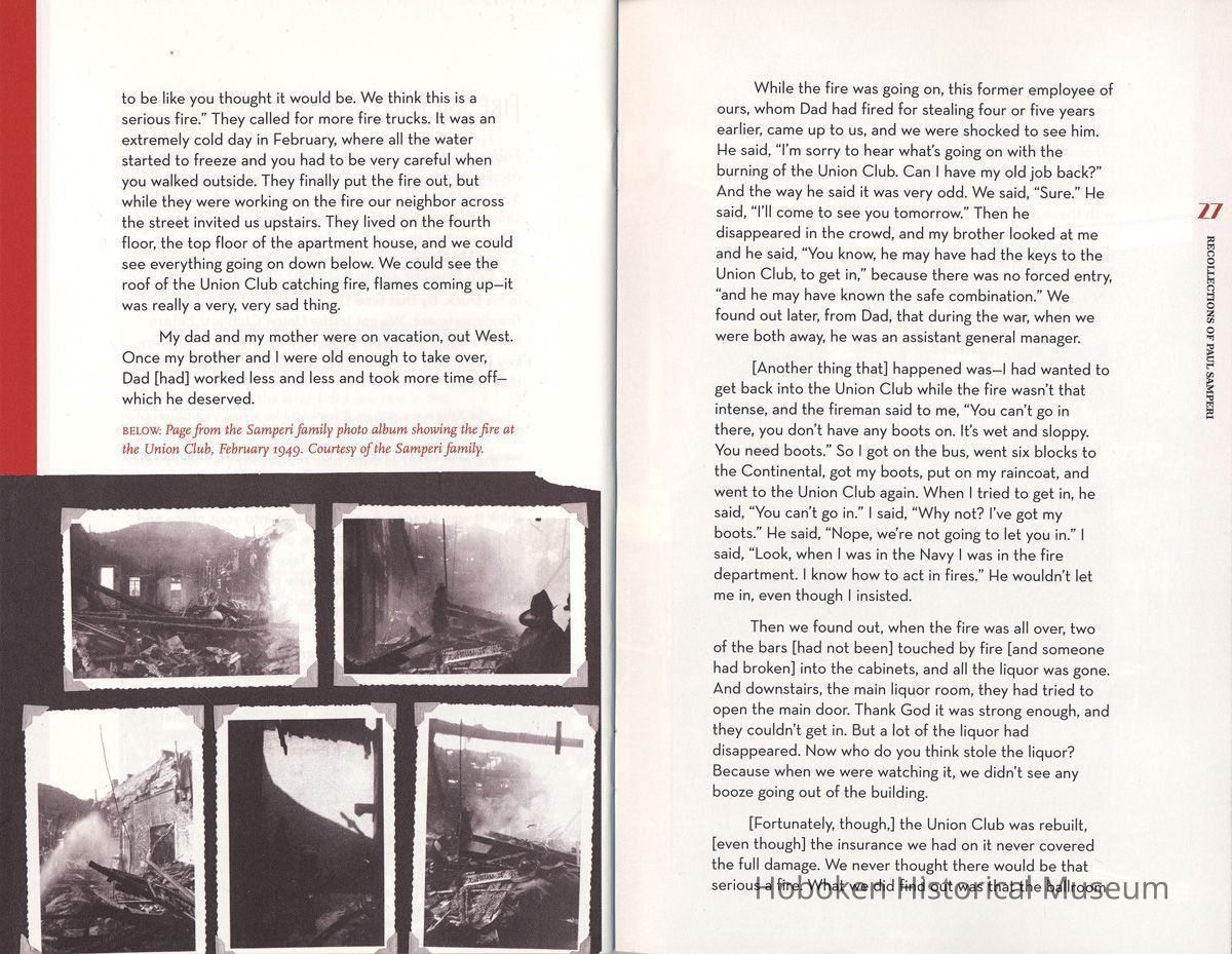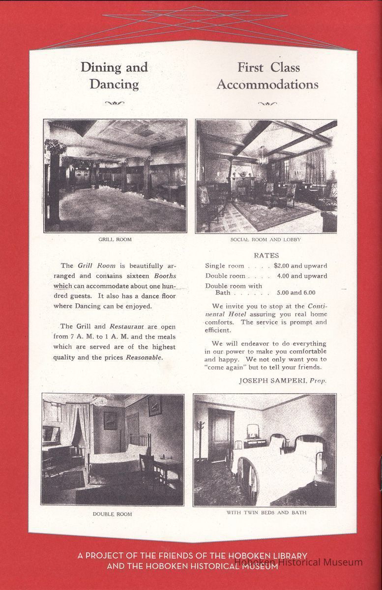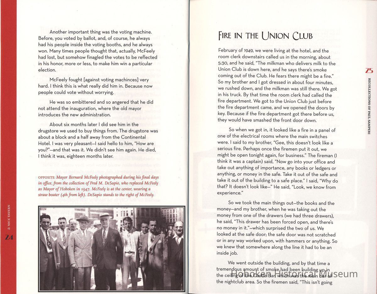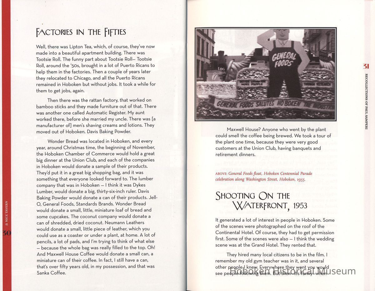 A Nice Tavern: Remembering the Continental Hotel and the Union Club. Recollections of Paul Samperi. Hoboken: The Hoboken Oral History Project, 2008. 1st edition thus. 8vo booklet, illustrated, pp. [ii], 38 plus cover. Ten copies.