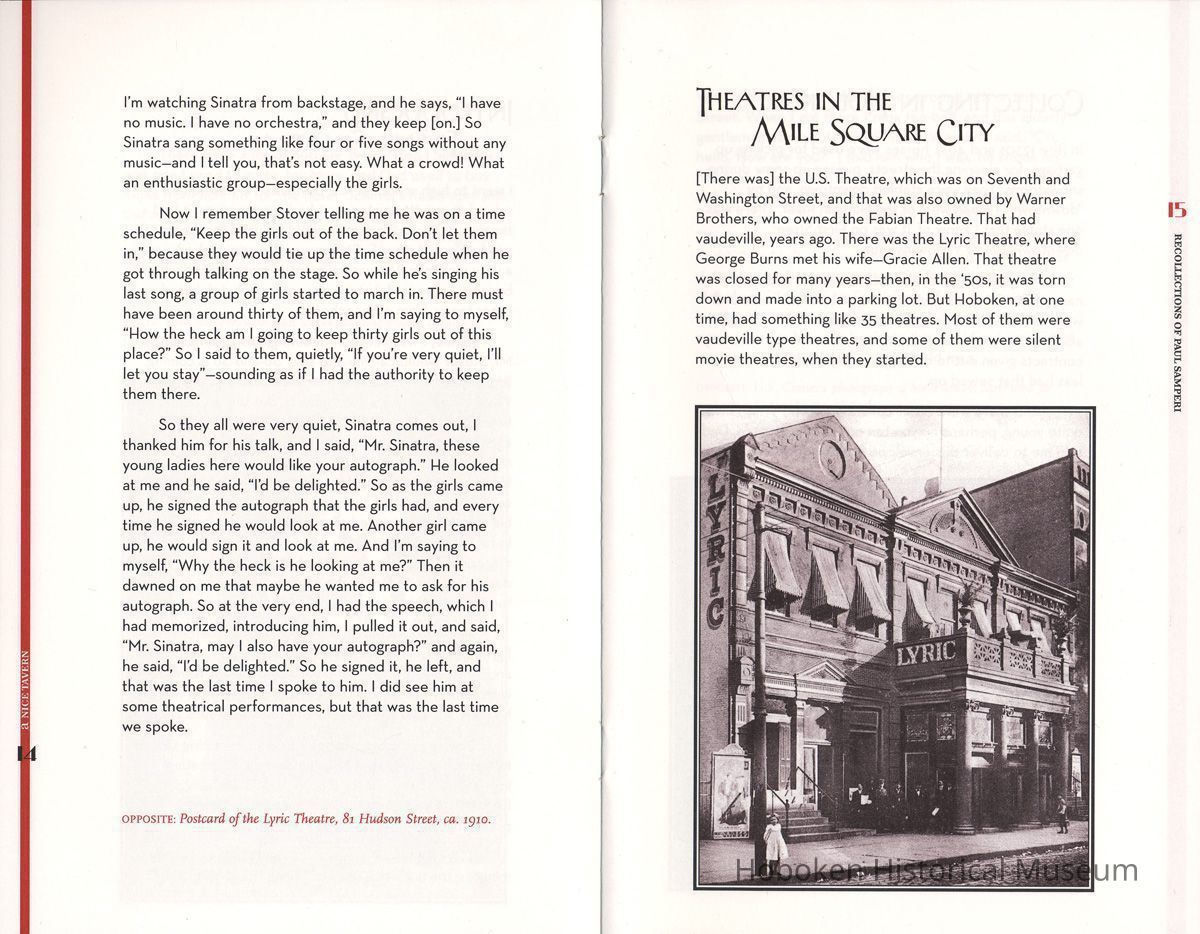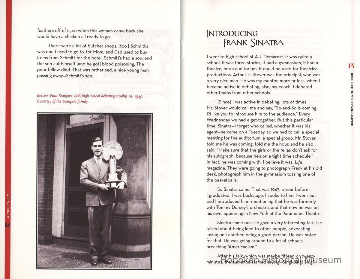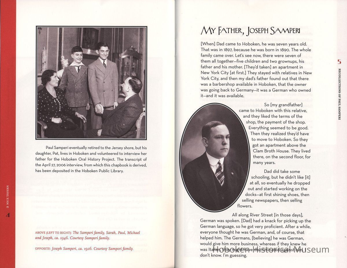 Seventeenth in the series of chapbooks titled: Vanishing Hoboken: The Hoboken Oral History Project. A project of The Friends of the Hoboken Public Library and the Hoboken Historical Museum. Chapbook published by the Museum under project grant. Interview conducted by daughter Patricia Samperi on April 27, 2007. Transcript of interview is on file at the Hoboken Public Library.