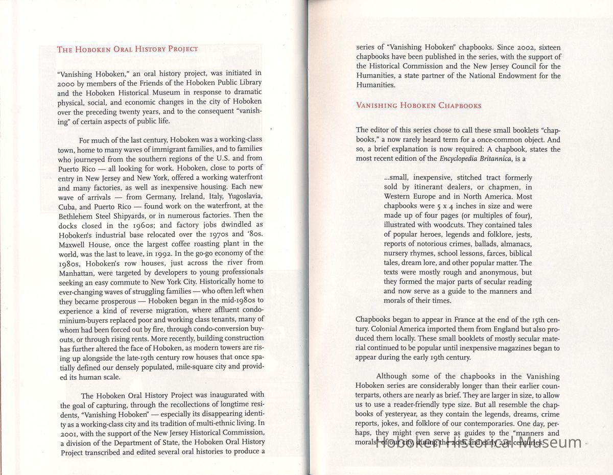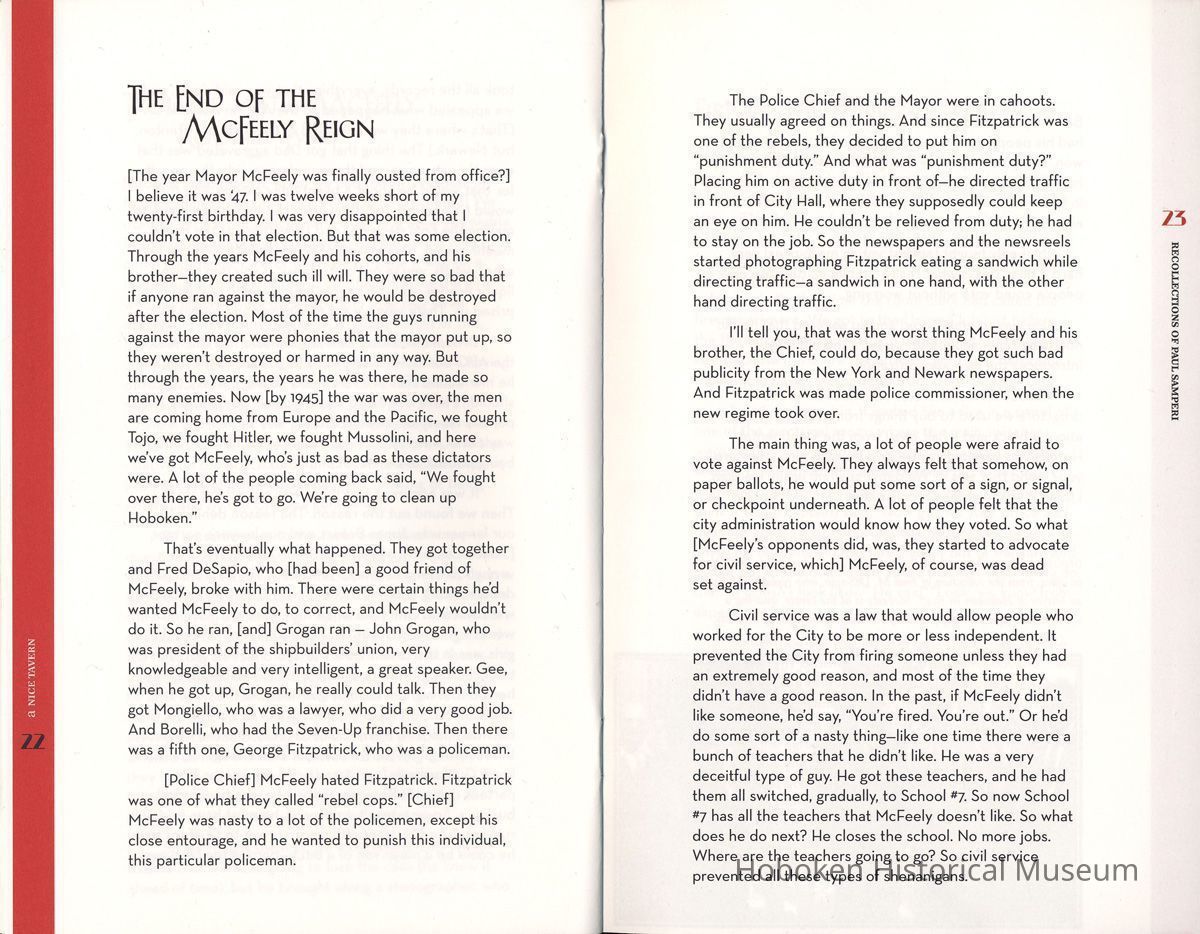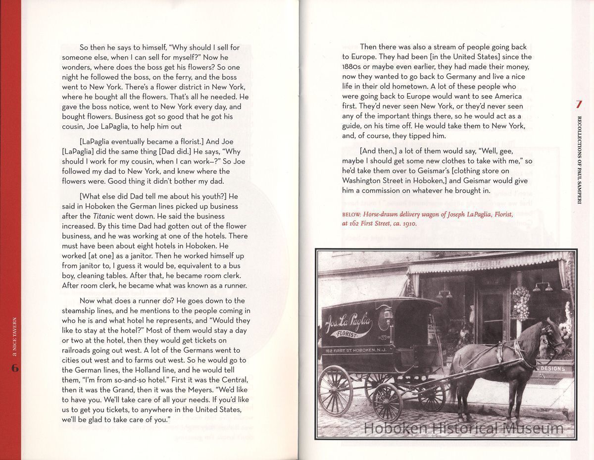Seventeenth in the series of chapbooks titled: Vanishing Hoboken: The Hoboken Oral History Project. A project of The Friends of the Hoboken Public Library and the Hoboken Historical Museum. Chapbook published by the Museum under project grant. Interview conducted by daughter Patricia Samperi on April 27, 2007. Transcript of interview is on file at the Hoboken Public Library.