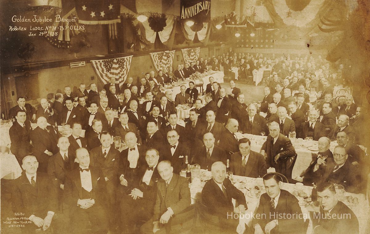 Sepia-tone group photo of Golden Jubilee Banquet, Hoboken Lodge No. 74 - B. P.O. E., Jan. 29th 1938.