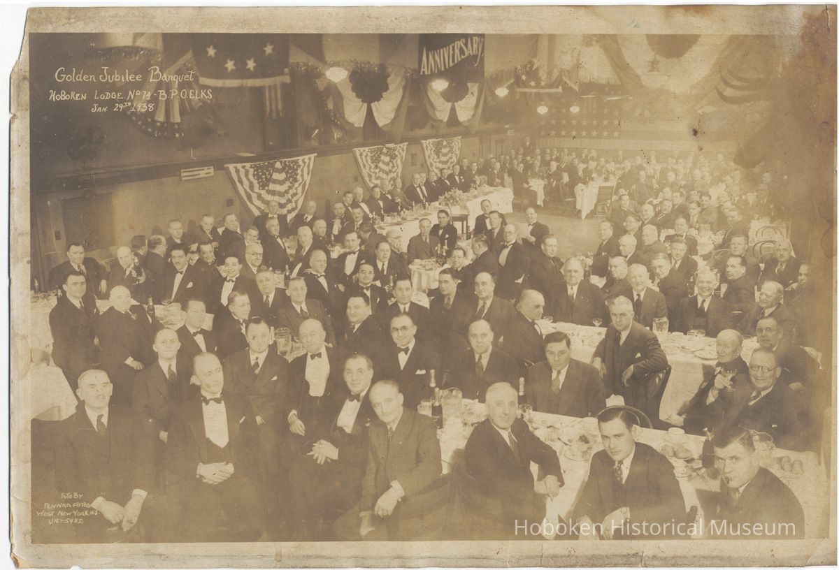 Where this Benevolent Protective Order of Elks dinner or banquet was held for their fiftieth (50th) anniversary is not given, but the room is not the Elks Lodge or Club at 1005 Washington St., Hoboken. Note the elk head on wall at upper right.