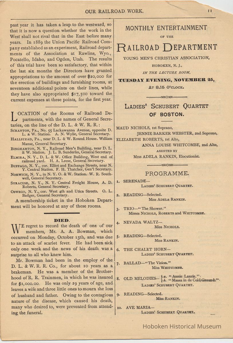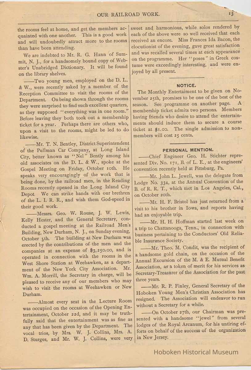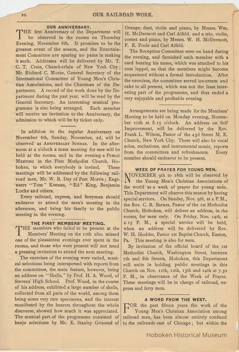 Our Rail Road Work. Vol. I, No. 2, Nov. 1890. Published by the Rail Road Dept., Y.M.C.A., Hoboken, N.J.