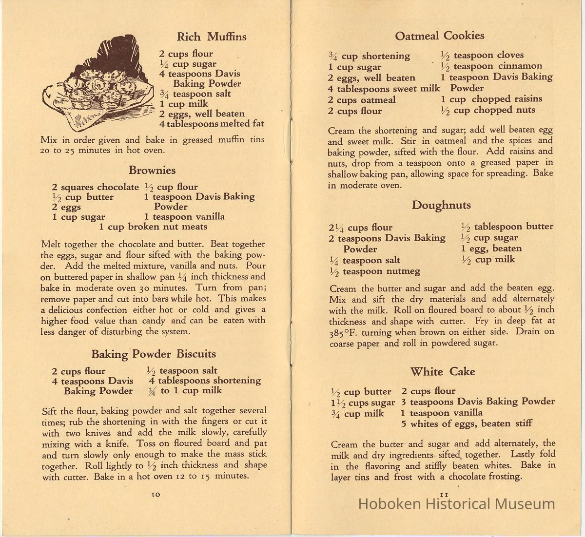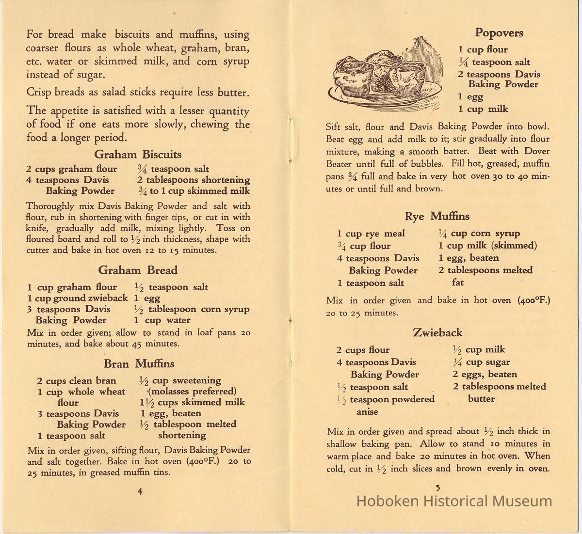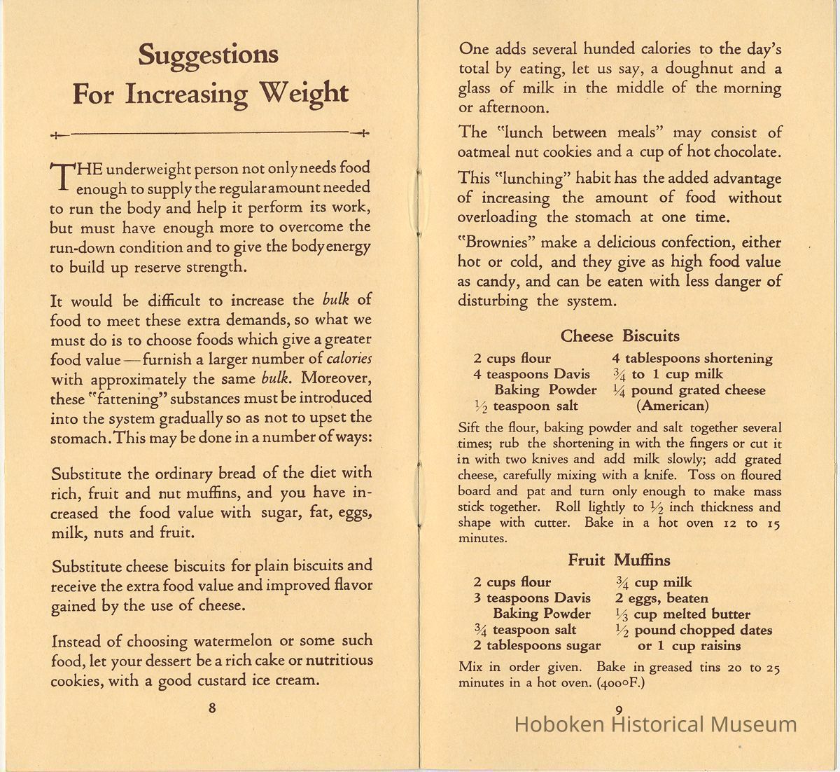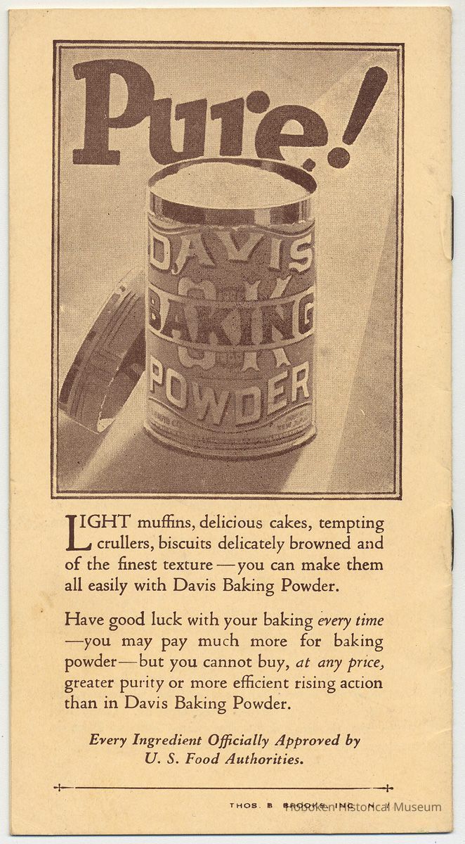 Publication promoting the Davis company's main product, Davis Baking Powder, which is shown in a photo on the back cover. The recipes either for reducing or increasing weight include the product in the ingredients. It also has some dietary or eating suggestions for other foods.