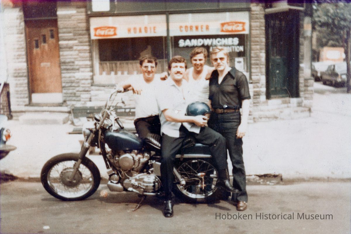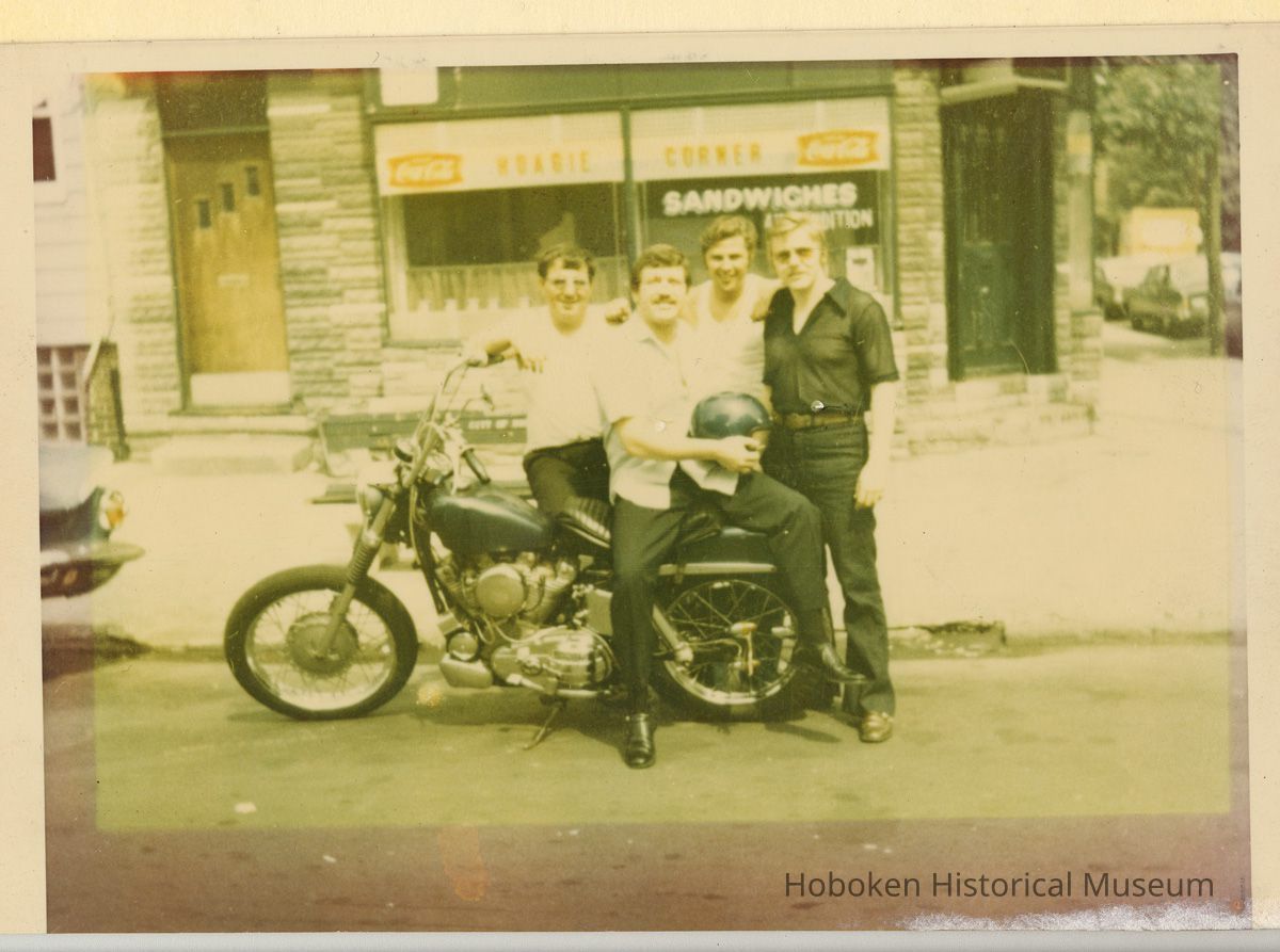 Color photo of Donald or Ducky Fontana with 3 men & motorcycle outside restaurant, Hoboken, n.d., ca. 1965.