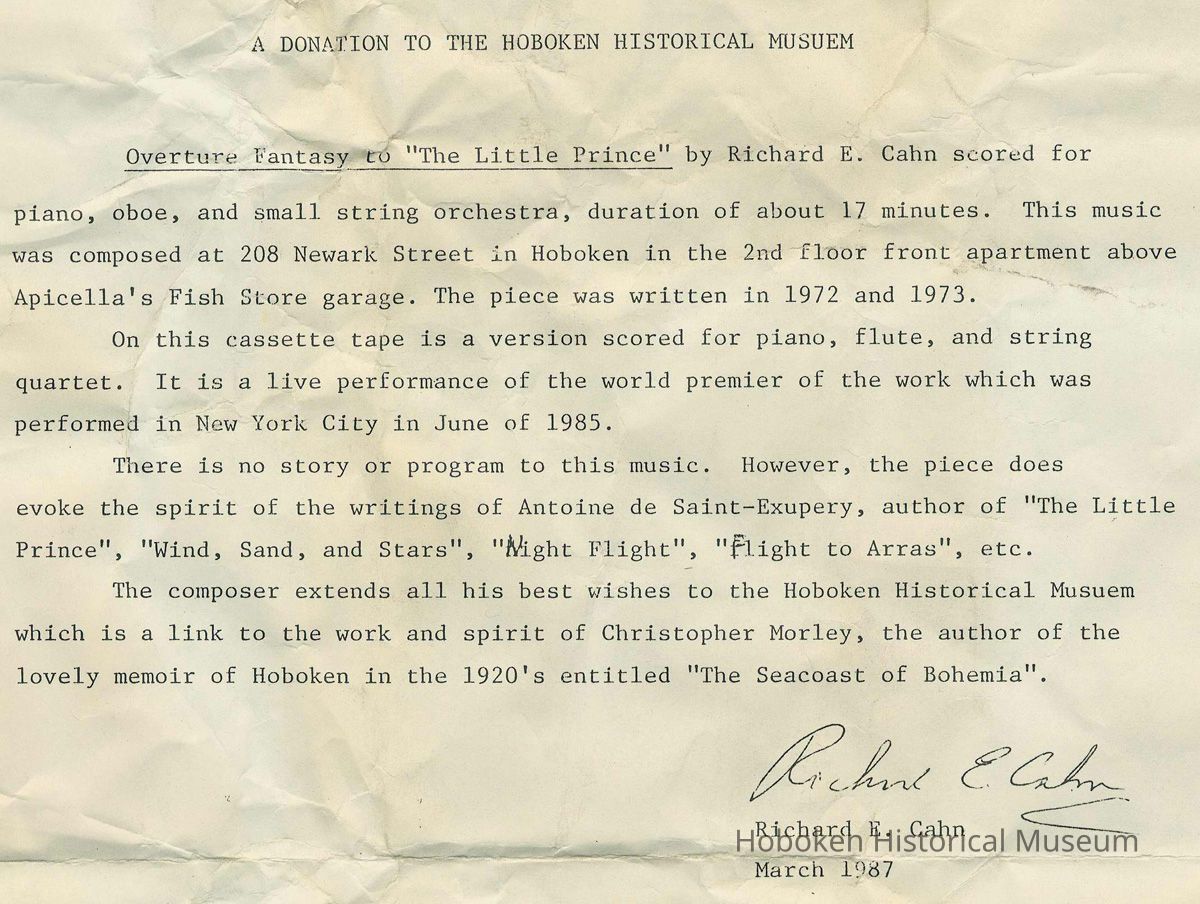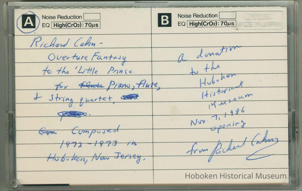 Audio cassette tape: Overture Fantasy to "The Little Prince" composed by Richard E. Cahn in Hoboken, 1972-73.