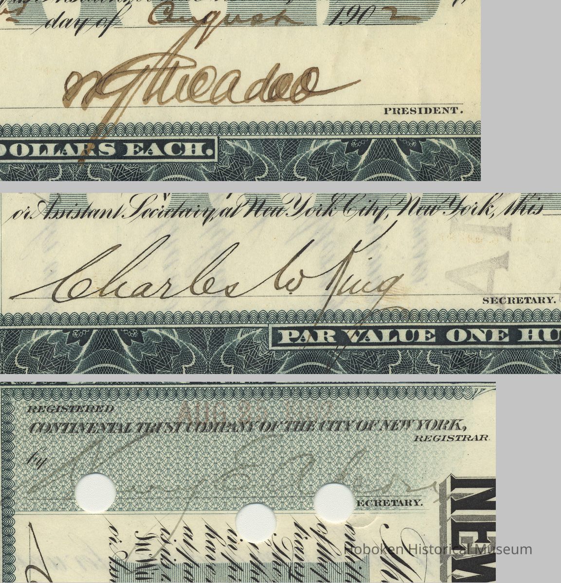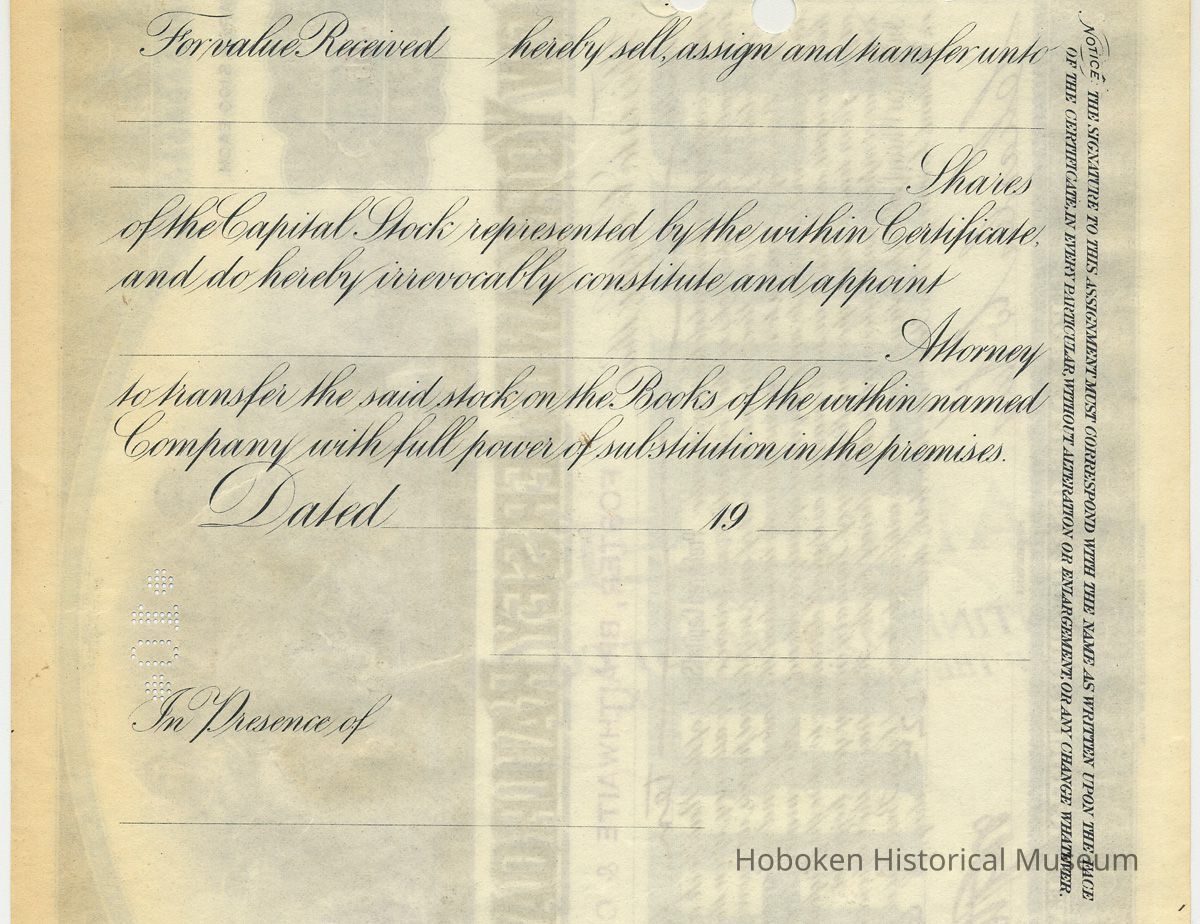 Stock certificate: N.Y. & Jersey Railroad Co.; issued to Foster, Braithwaite & Co.; 10 shares preferred; signed by William G. McAdoo, Aug. 22, 1902.