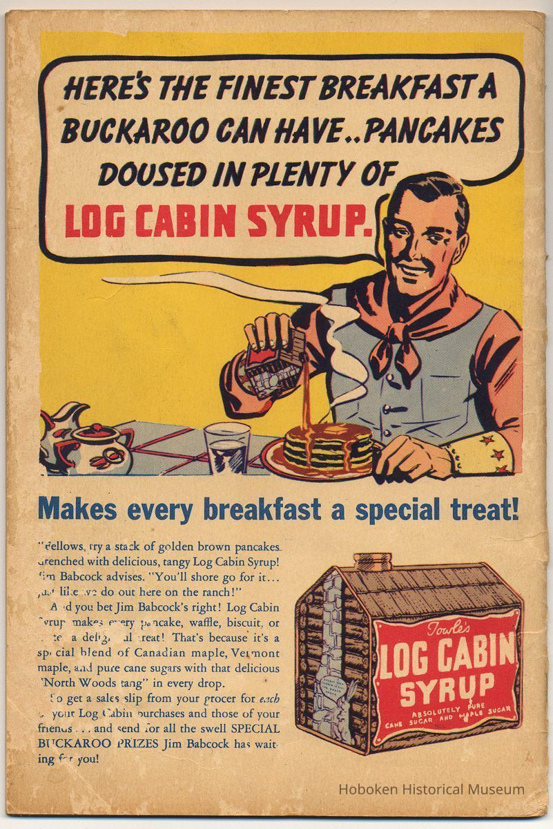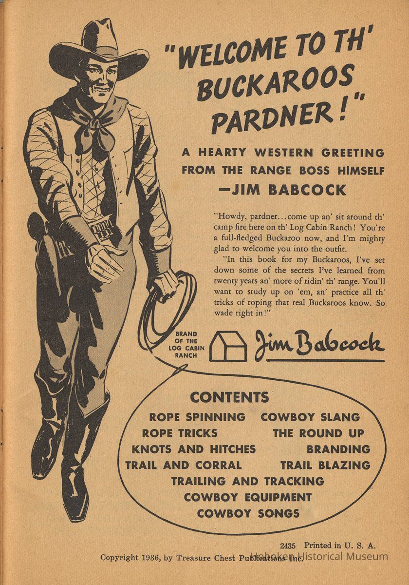 Booklet, Log Cabin Syrup premium: Jim Babcock's Buckaroo Book. [N.Y.]: Treasure Chest Publications, Inc., copyright 1936.
