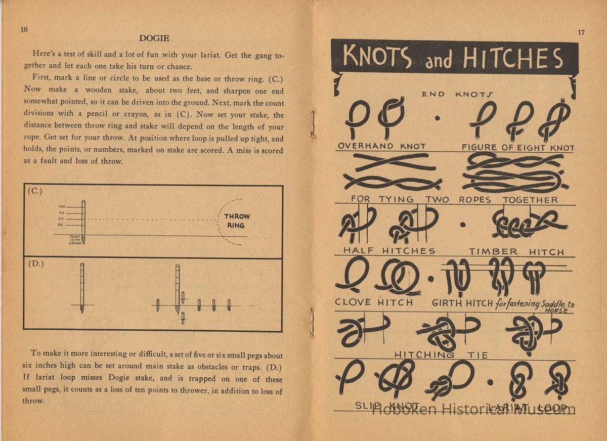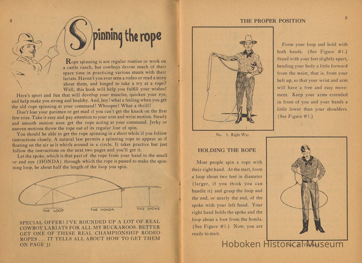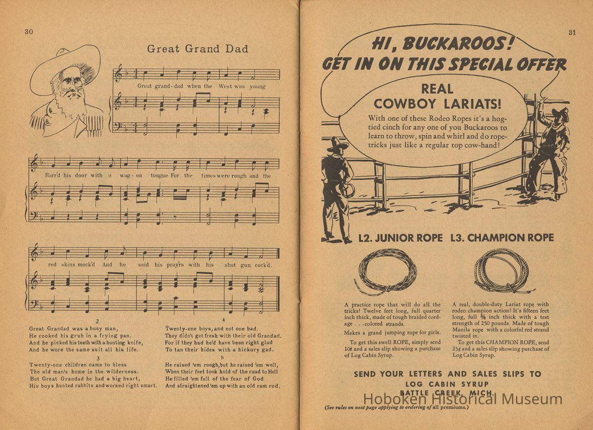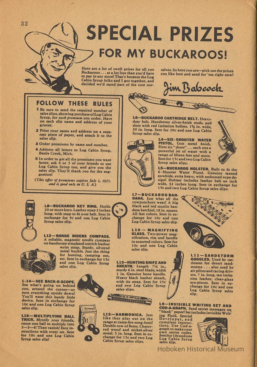 Catalogue pages for toy premiums, "Prizes for Buckaroos", that could be purchased for small amounts of money and proof of purchase - "one Log Cabin Syrup sales slip" are page 31 with offers for three different lariats (lasso ropes)and page 32 where 13 smaller items were shown. While the syrup was made in Hoboken (the city is not mentioned in it), orders for fulfillment were sent to: Log Cabin Syrup, Battle Creek, Mich. The offer expired July 1, 1937.