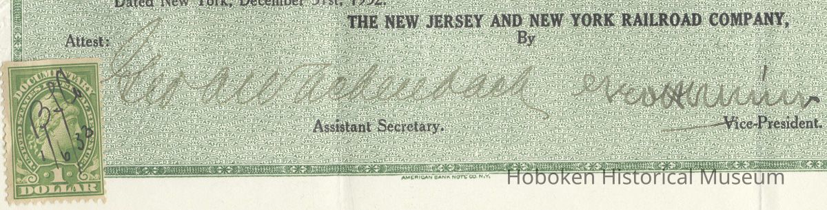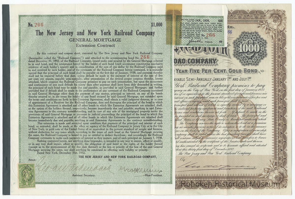Bond: New Jersey & New York Railroad Co., Jersey City; $1000 Mortgage Bond, 1892; 1932 Extension Contract