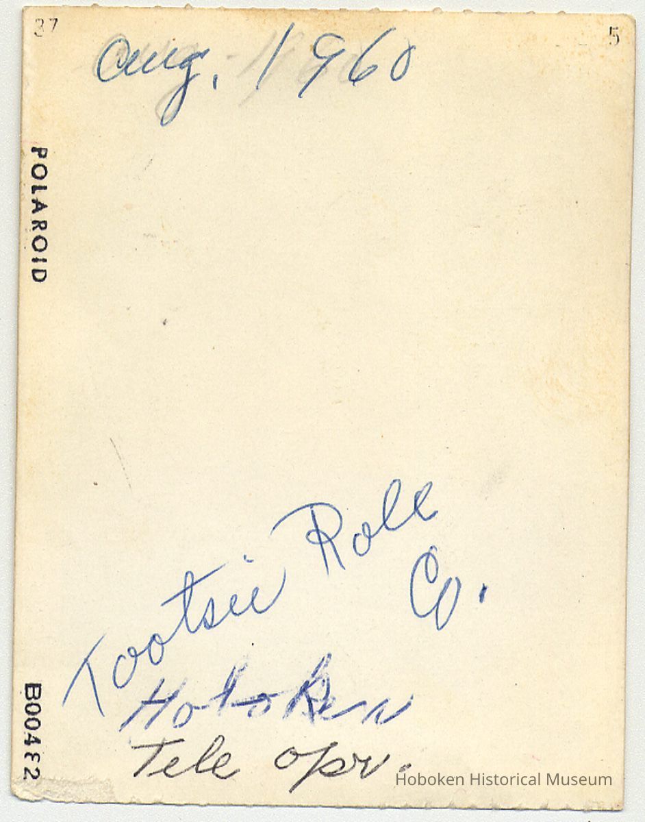 Black-and-white photos, three, of Marie Feroldi at Sweets Company of America (Tootie Roll Co.), 1515 Willow Avenue, Hoboken, August 1960 & May 1961. Digital scans of original images. Reference prints on file. All originals were black-and-white polaroid prints; contemporary and modern notes by Feroldi on reverse. Photographer(s) not known.