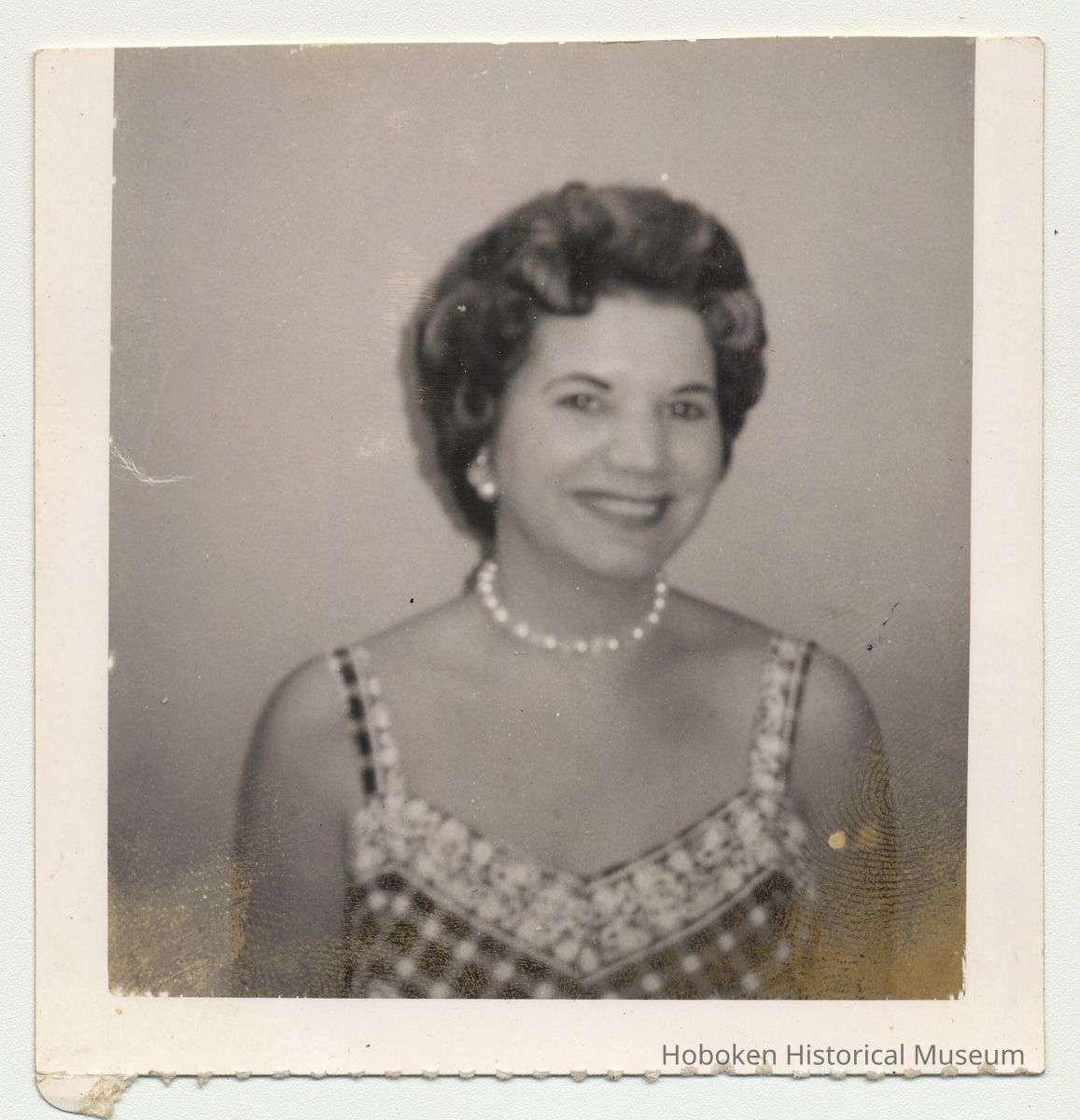 Photo 2: B+W polaroid photo (clipped) of Marie Feroldi at Sweets Company of America, Hoboken, [August] 1960. Although month was not stated, she is wearing the same dress and pearl necklace seen in photo 1 which was stated as August. (original print: 2-1/4" wide x ca. 2" high)