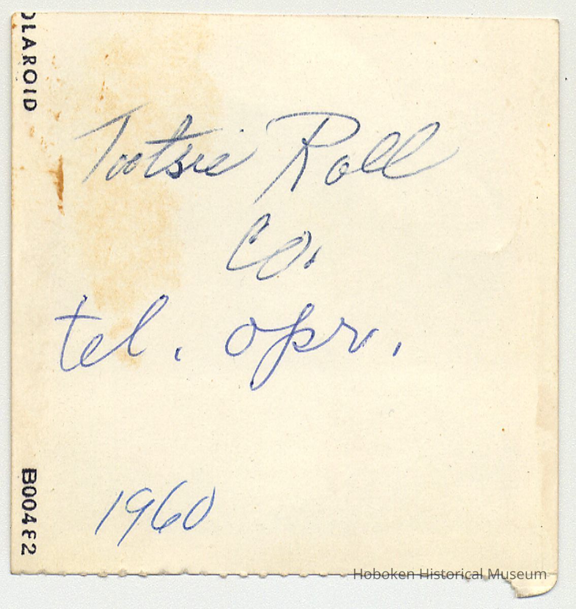 Photo 1: B+W polaroid photo of Marie Feroldi seated at telephone switchboard, Sweets Company of America, Hoboken, August 1960. (original print: 2-1/4" x 3-1/2" high)