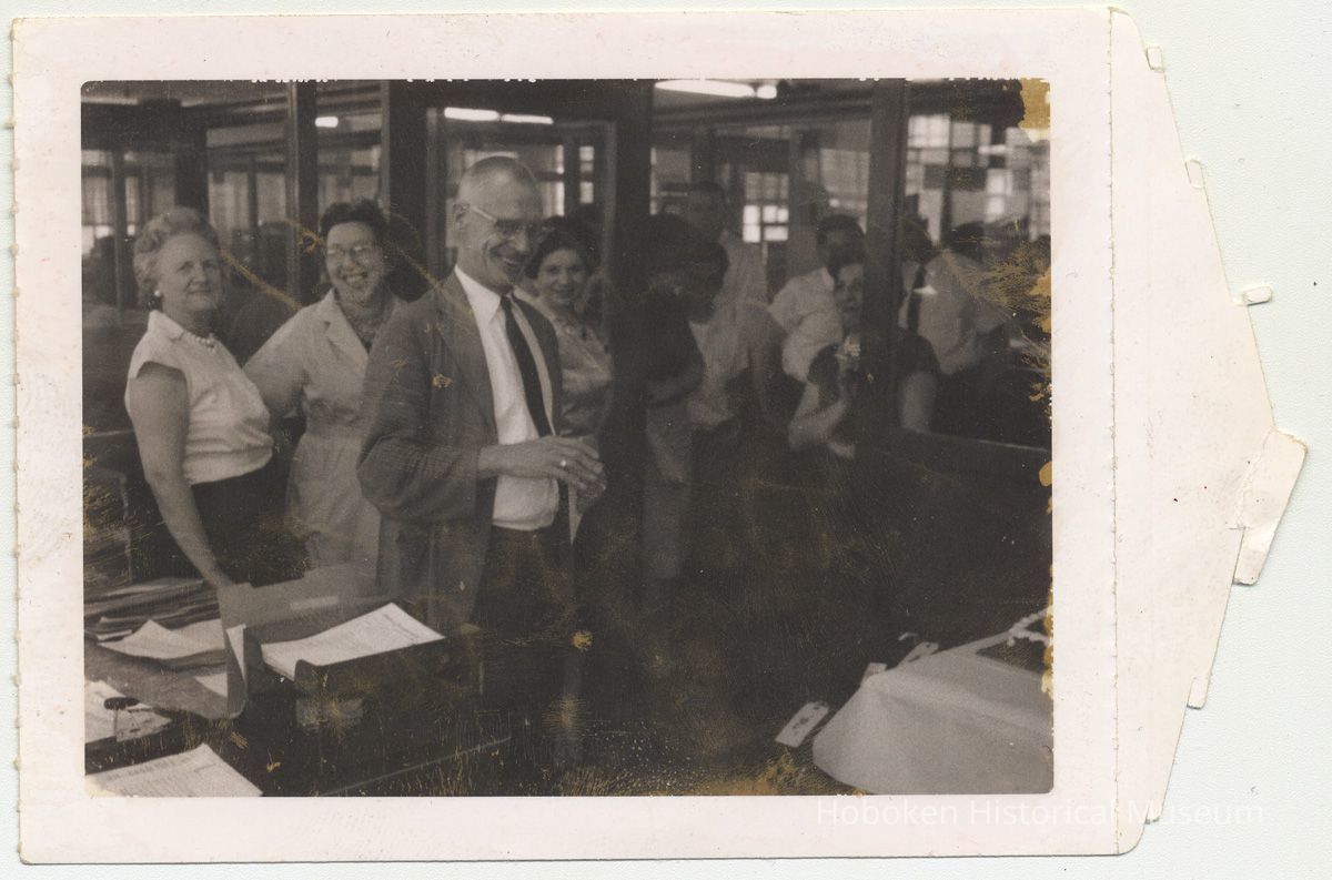 Photo 3: B+W polaroid photo of Marie Feroldi with co-workers in offices at Sweets Company of America, Hoboken, May 26, 1961. Marie is the fourth person from the left (behind left shoulder of man in foreground.) Other people are not identified. (original print: 2-1/4" x 3-1/2" wide with film tab still attached)