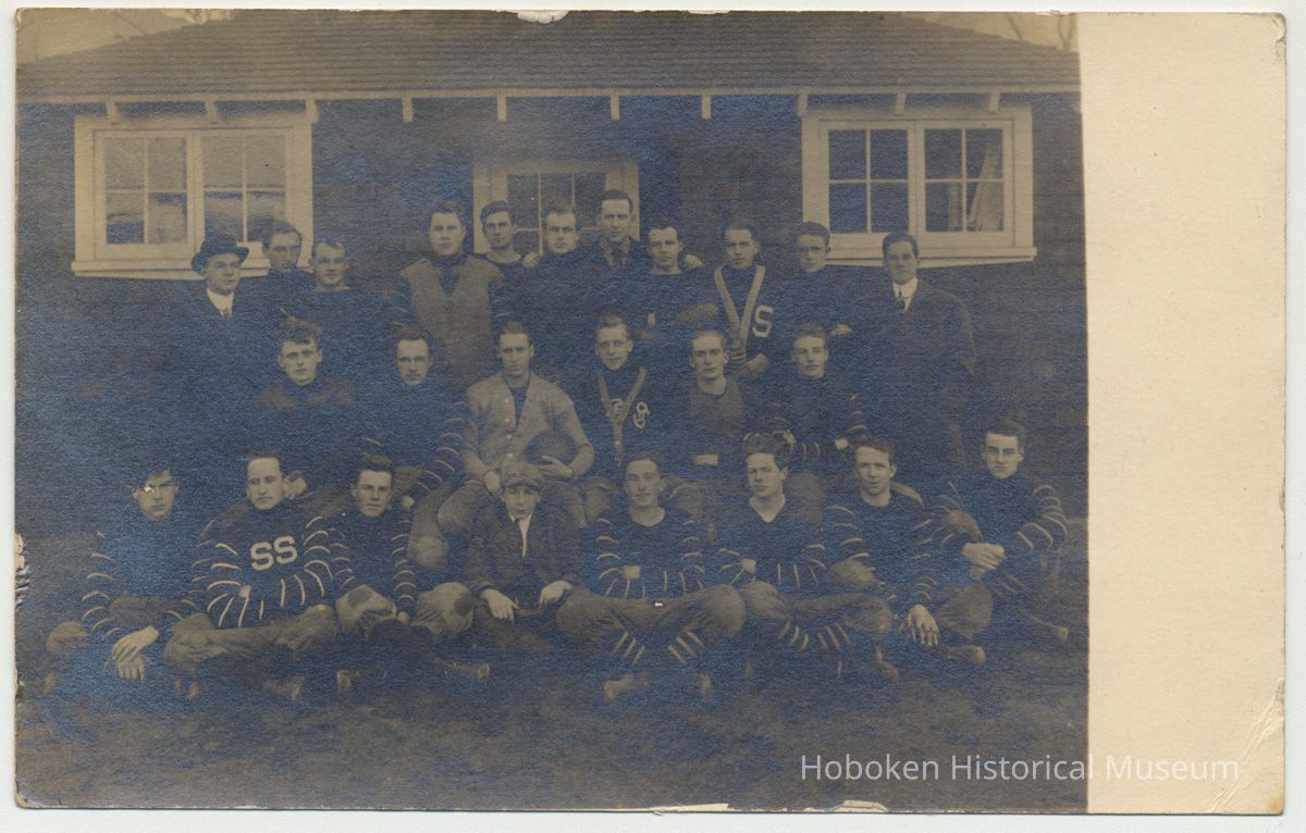 Team members and a coach are posed outside a building on the campus of Stevens Institute of Technology. A few boys wear letter sweaters or uniforms with 'S' or 'SS'.
