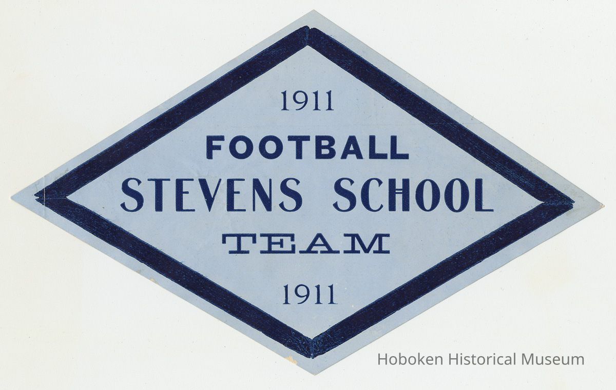 With: printed diamond-shaped emblem, blue paper & ink, titled and dated: "1911 Football Stevens School Team 1911"; reverse is blank. This item and the postcards show damage from previous album mounting. See notes.