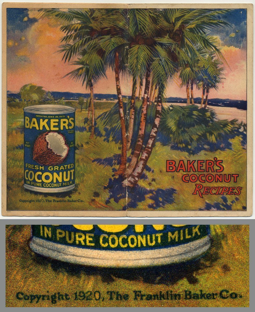 Booklet: Baker's Coconut Recipes. Copyright 1920 The Franklin Baker Co., Philadelphia and New York. Printed pamphlet, 3-1/2" x 6" high, 13 pp plus covers. Color covers and illustrations.